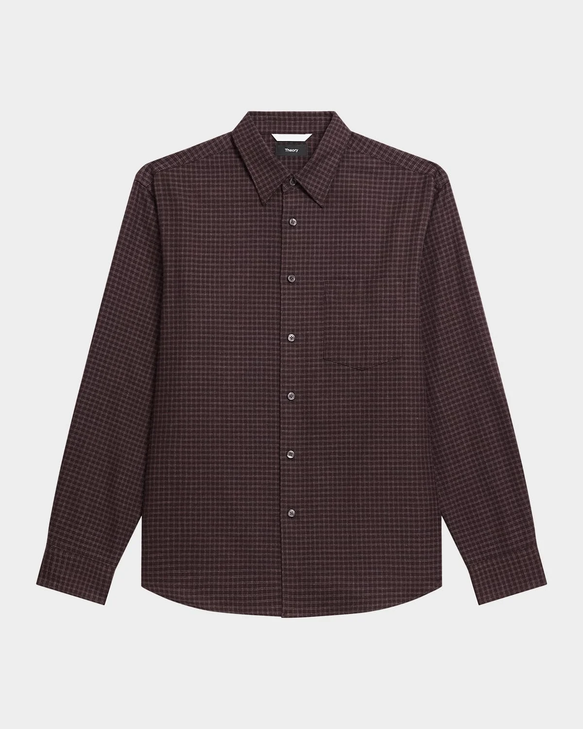 The "Weekend" shirt by Theory is woven using soft cotton for a warm flannel finish with a chest patch pocket for a classic, convenient touch. Point collar Button placket Chest pocket Long sleeves Round barrel cuffs Pleated back yoke Curved hem Modern fit Cotton Machine wash Imported