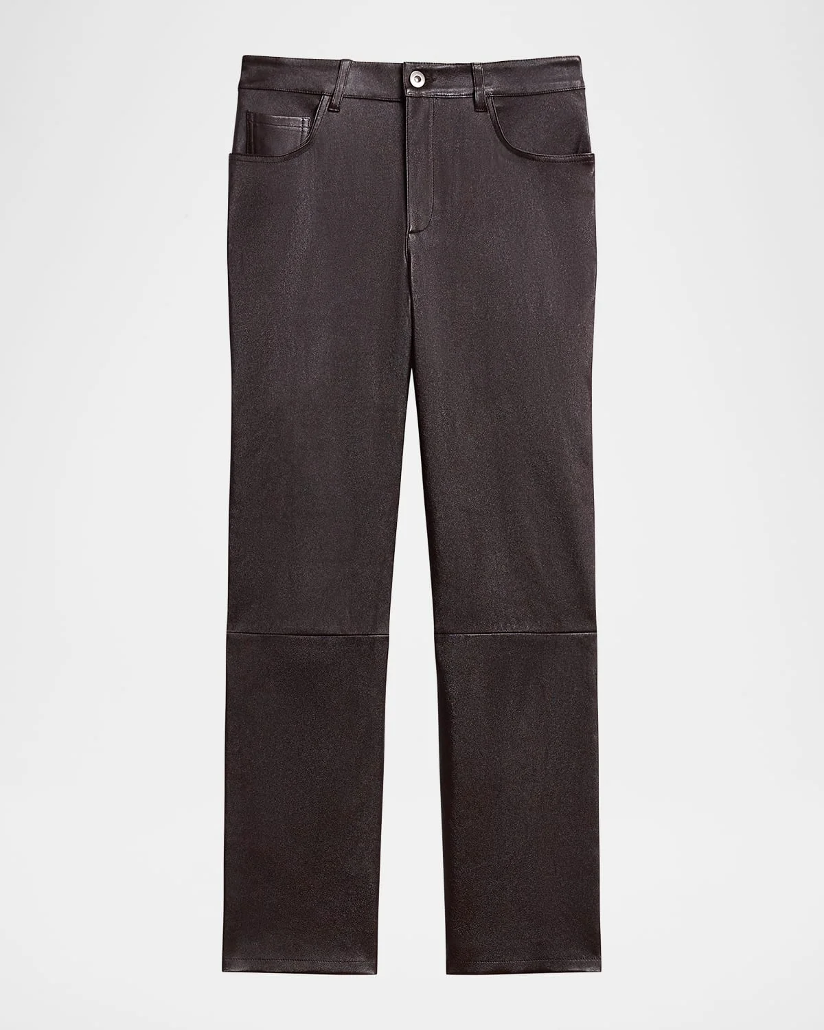 Crafted in smooth Nappa leather with a glossy sheen, these Theory pants exhibit paneled construction and seam details. Midrise; sits high on the hip Fivepocket style Straight legs Ankle length Button/zip fly; belt loops Leather Professional cleaning recommended Imported