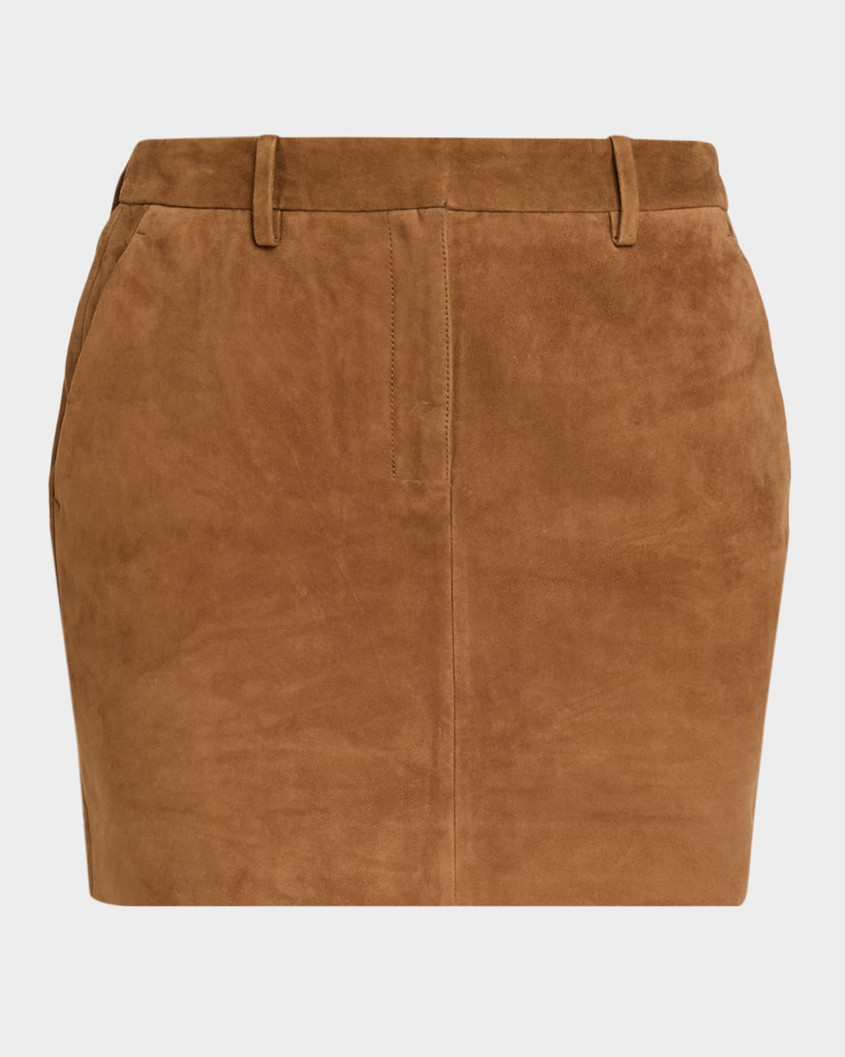 - Elevated mini skirt by Theory, tailored in a soft and supple suede. - Mid-rise; sits high on the hip - Side slant pockets; faux back pockets - Skirt falls straight from hip to hem - Hem falls above the knee - Hook/zip fly; belt loops - Leather - Leather method dry cleaning - Imported