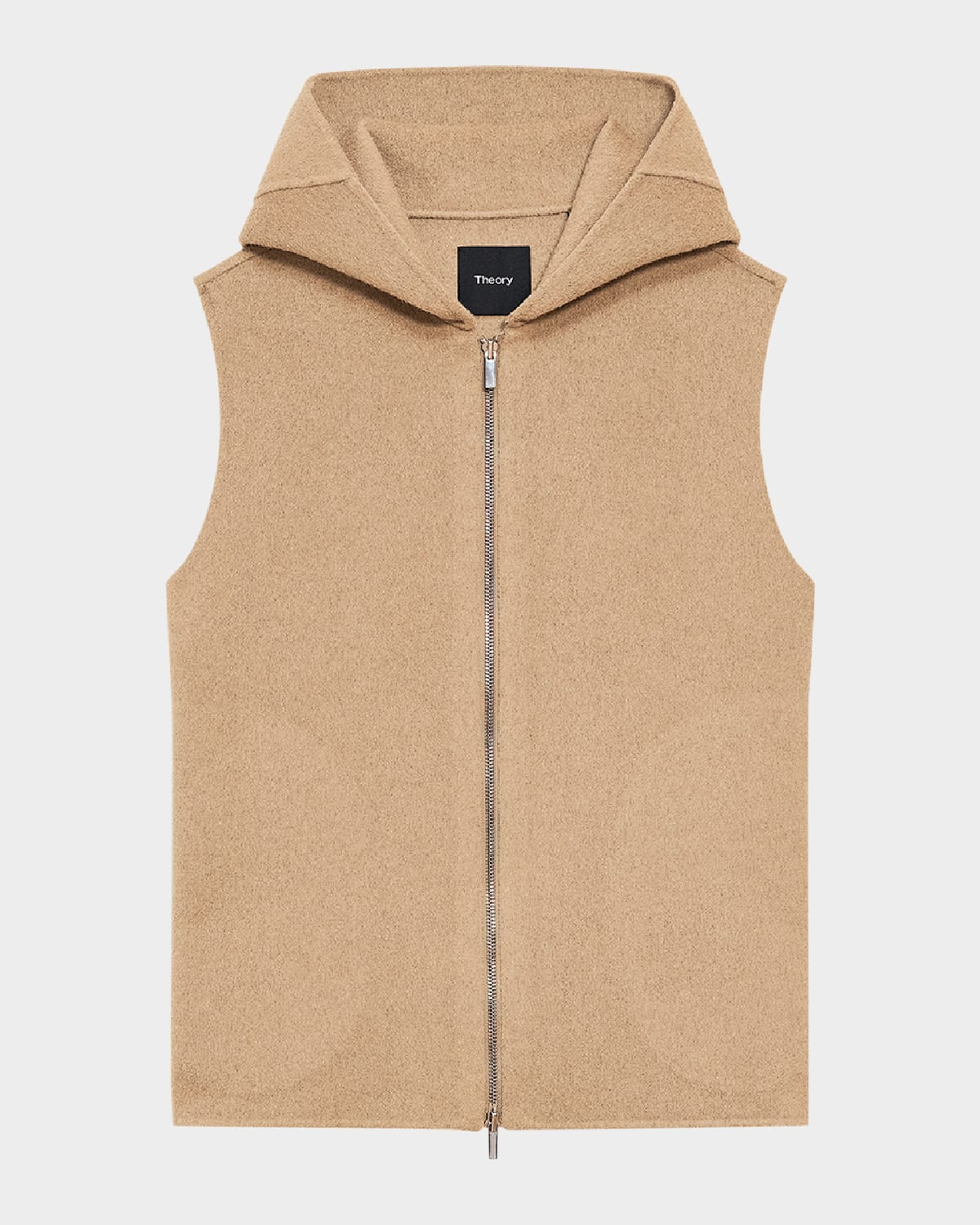 Theory vest boasts a clean silhouette and doubleface finishing Approx. 24"L from shoulder to hem Hooded; twoway zip front Sleeveless Onseam pockets Wool Dry clean Imported