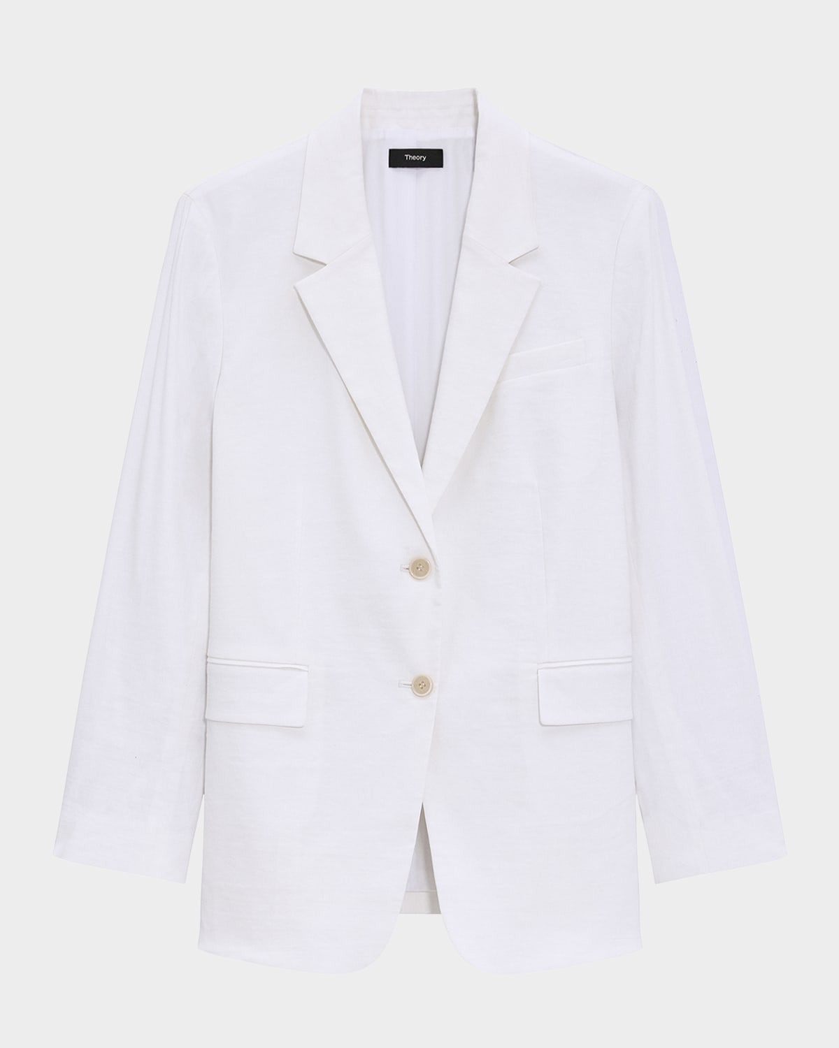 - An oversized, straight fit, single-breasted blazer with lower flap pockets, welt chest pocket, and vented button closure at sleeves. - Theory single-breasted blazer in Crunch Linen - Notch lapels - Long sleeves with button cuffs - Chest welt pocket - Hip flap pockets - Oversized fit - Double-vented back - Button-front - Linen/viscose/elastane - Dry clean - Imported