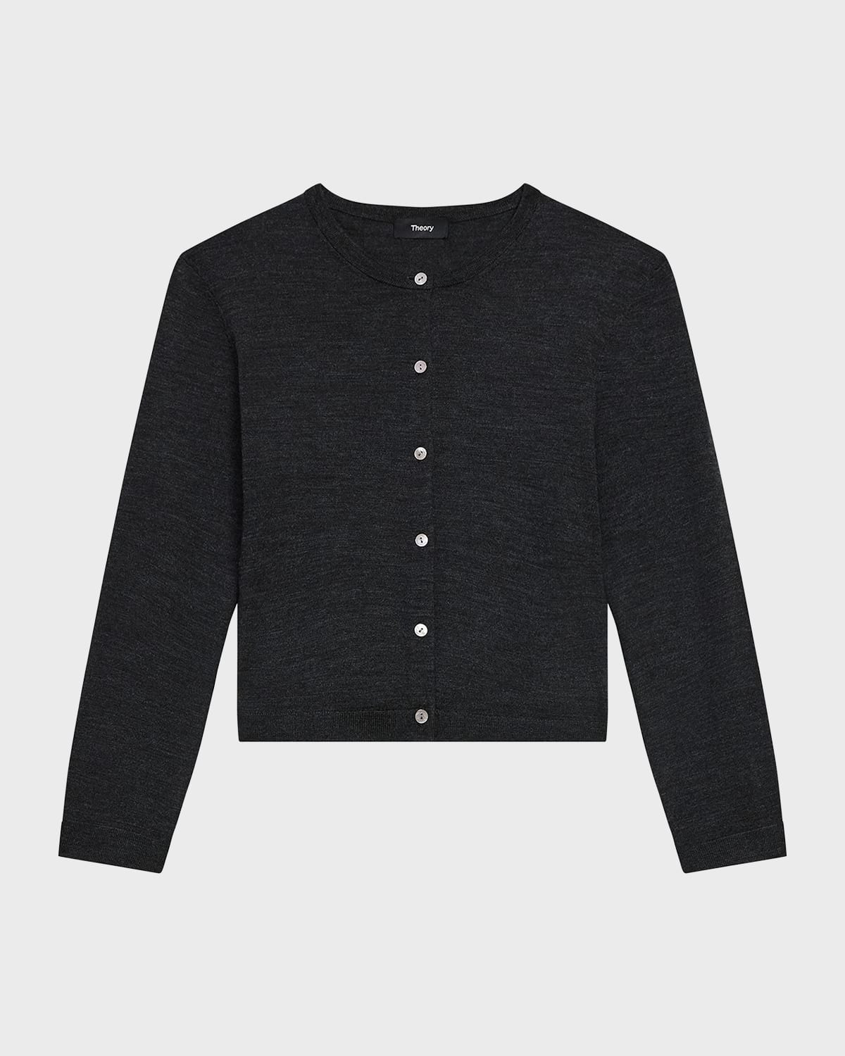 Theory classic cardigan finished with pearlescent buttons Crew neckline; button front Long sleeves Ribbed cuffs and hem Cropped length Slim fit Merino wool Dry clean Imported