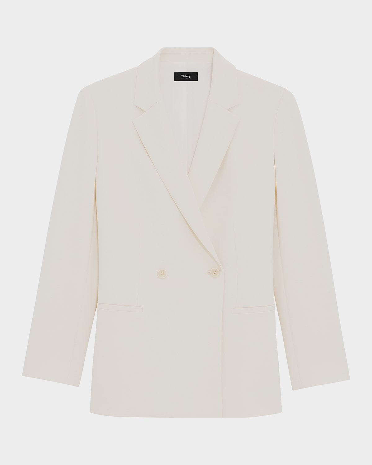 - A relaxed fit, full-length, double-breasted jacket with one row of buttons at closure, welt pockets, and a vent at the back and the sleeves. - Theory jacket featuring a double-breasted front - Notch lapels - Long sleeves with vented cuffs - Welt pockets - Relaxed fit - Vented back - Button-front - Triacetate/polyester - Dry clean - Imported
