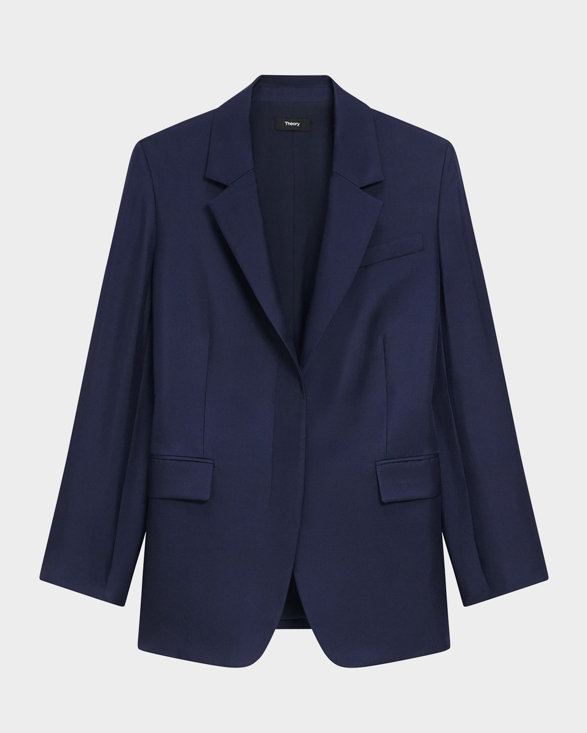 - Theory luxurious silk blazer enhanced with a cinched back for added shape - Notch lapels - Single-breasted front - Long sleeves with vented cuffs; approx. 32"L - Chest welt pocket - Hip flap pockets - Oversized fit - Concealed button-front - Silk - Dry clean - Imported