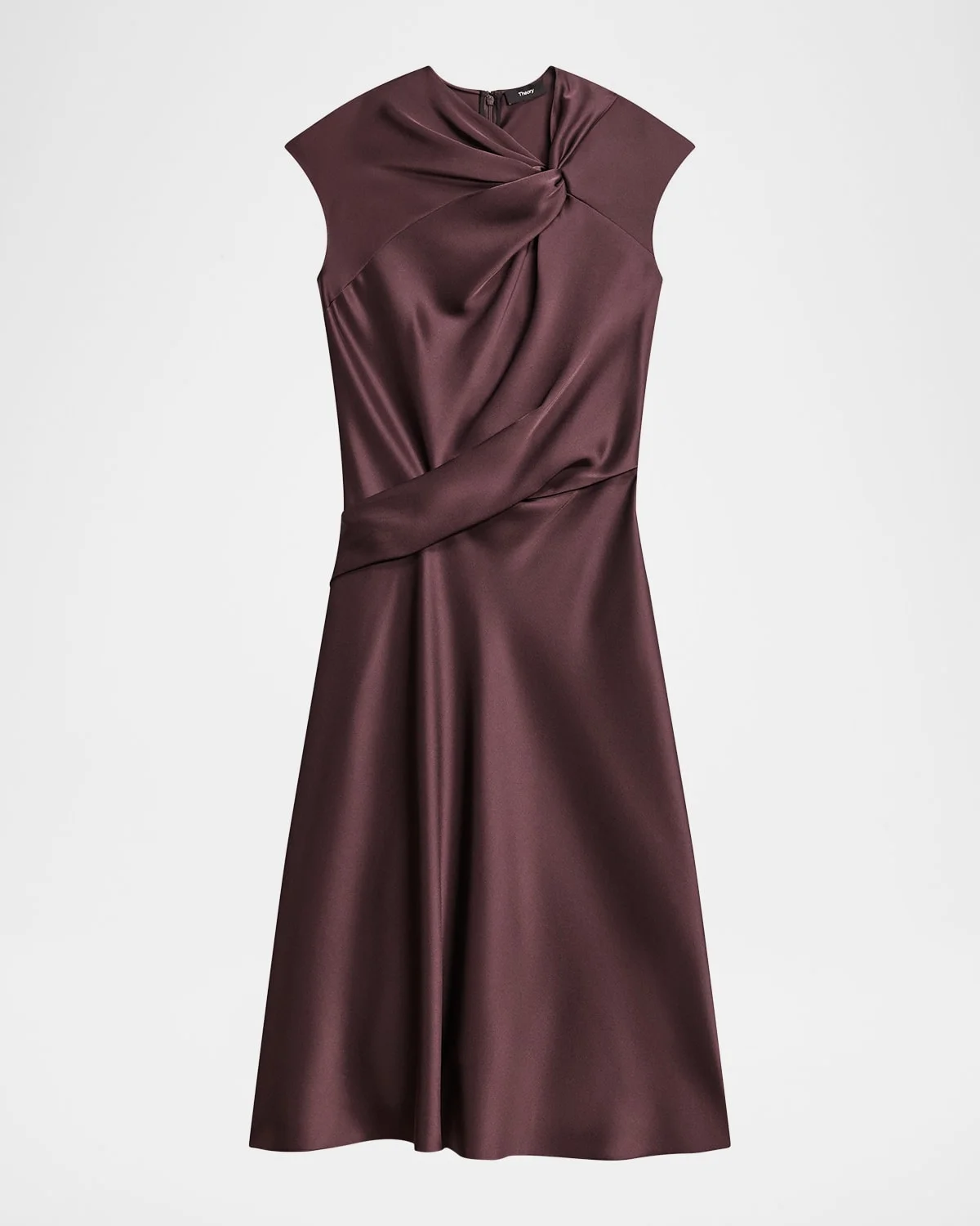 Luxe satin midi dress adorned with a draped bodice and twist detail by Theory. Asymmetric neckline Sleeveless Slip silhouette Hem falls just below the knee Center back zip Triacetate/polyester Dry clean Imported
