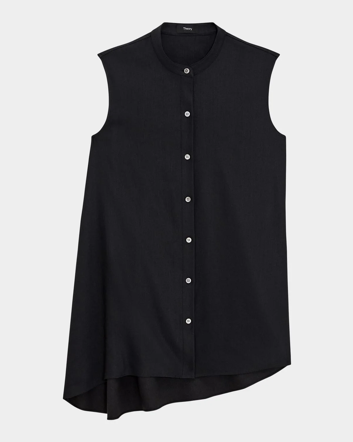 - A sleeveless collarless button-down tunic with an asymmetric drape at the wearer's right side. - Theory draped linen-blend tunic - High neckline - Sleeveless - Loose fit - Asymmetric hem - Button-front - Linen/viscose/elastane - Imported