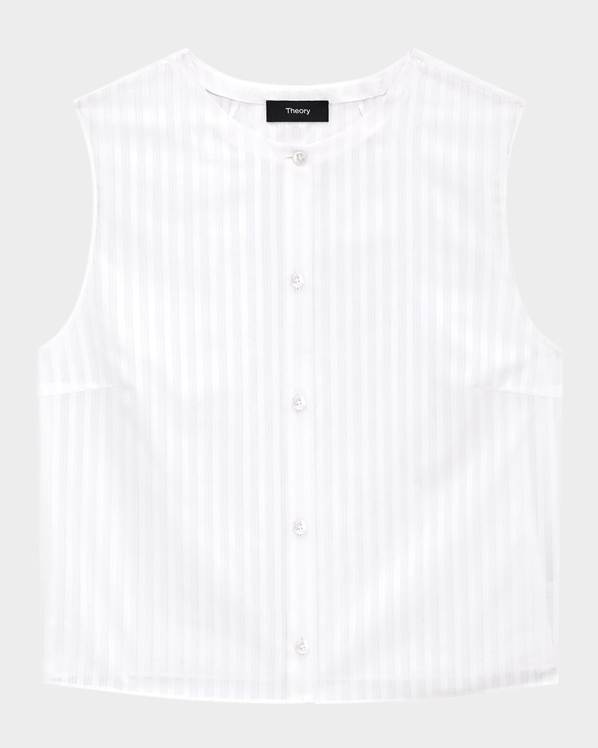 - A minimal cropped sleeveless straight shell with a button-front placket. - Theory striped cotton shell - High neckline - Sleeveless - Boxy fit - Cropped length - Button-front - Cotton - Imported