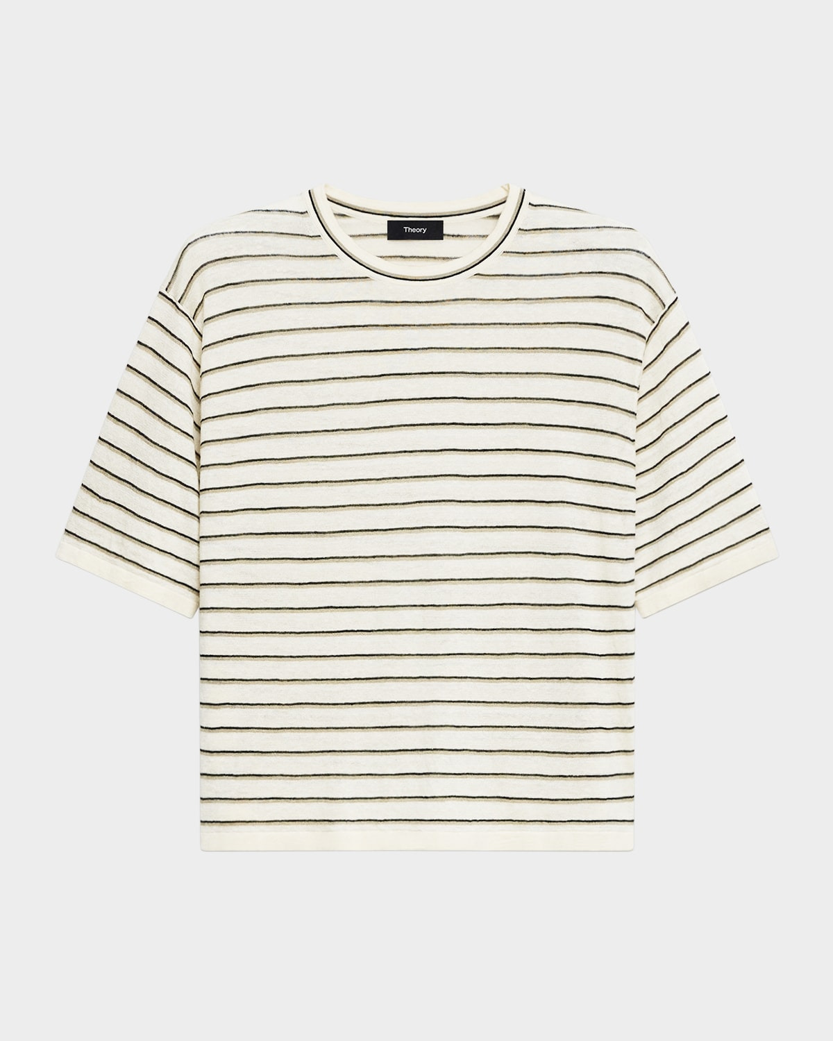 - Theory striped knit boyfriend tee - Crew neckline - Short sleeves - Relaxed fit - Hem falls to the hip - Pullover style - Linen/viscose - Dry clean - Imported