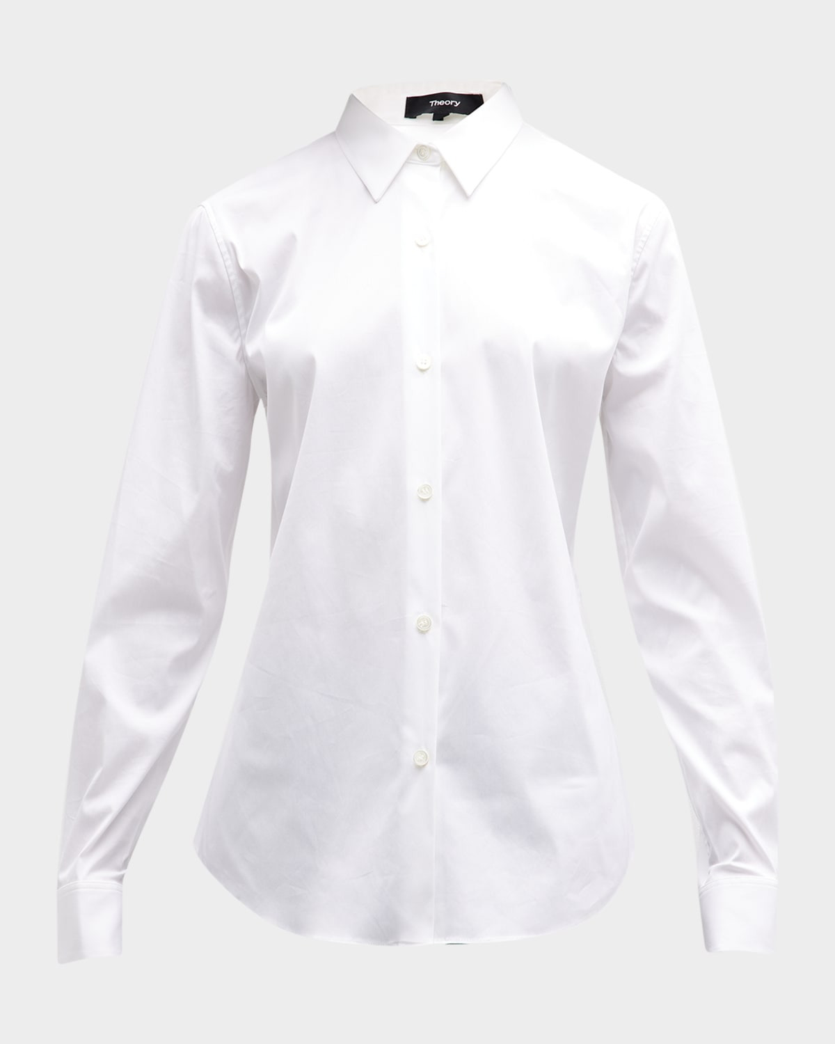 Theory Tenia blouse in Luxe poplin. Approx. measurements: 25"L center front to hem, 28"L center back to hem. Spread collar; button front. Long sleeves; barrel cuffs; 25"L. Relaxed fit. Shirttail hem. Cotton/nylon/spandex. Dry clean. Imported.