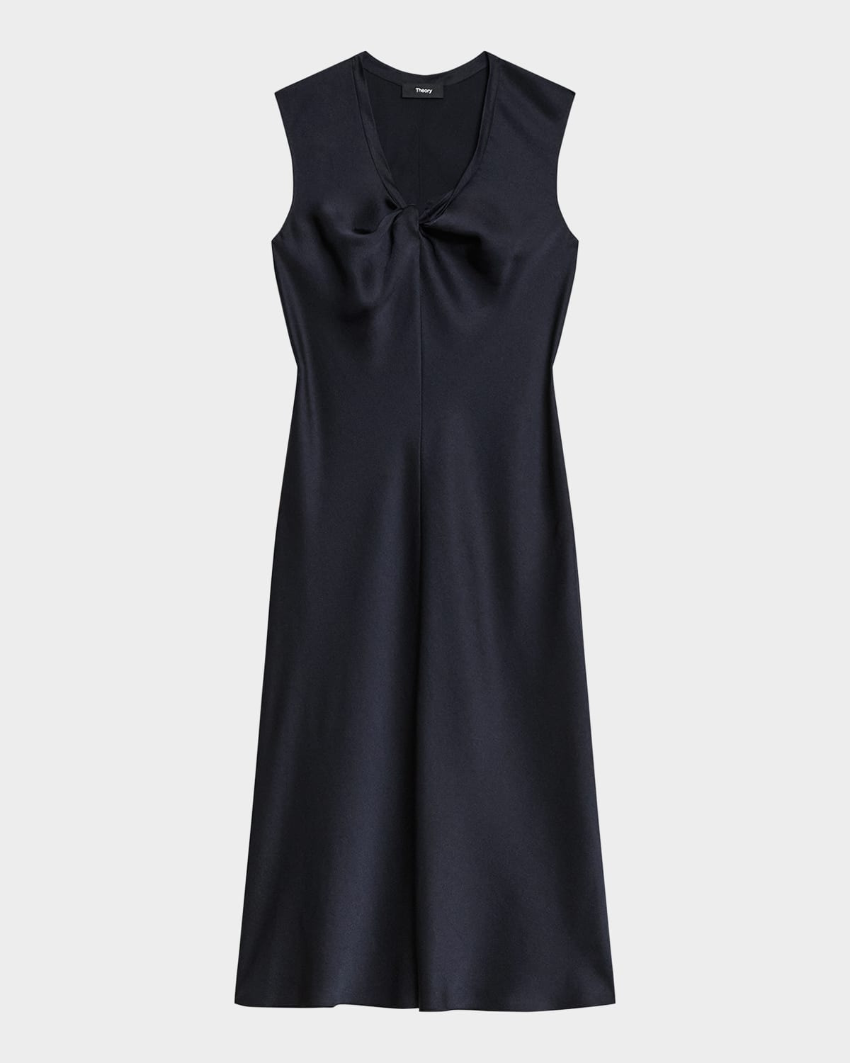 - Theory bias-cut satin midi dress enhanced with a twisted scoop neckline - Sleeveless - Slip silhouette - Hem falls below the knee - Slipover style - Polyester - Imported