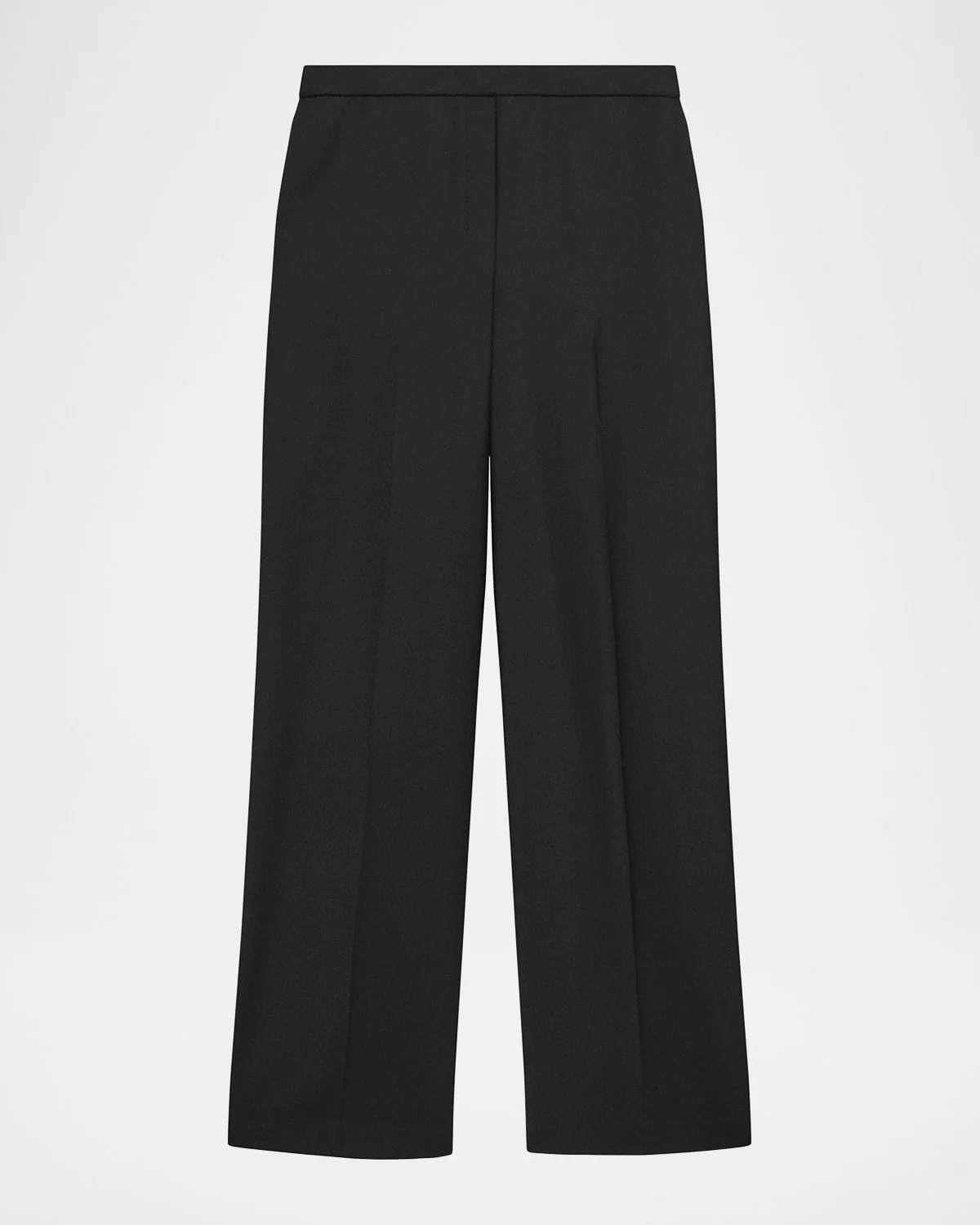 Wideleg wool pants with a luxe sheen by Theory. Approx. 15" rise; 32" inseam; 43" outseam Midrise; sits high on the hip Elastic waistband Side seam pockets; single back pocket Straight fit Full length Pullon style Wool Dry clean Imported