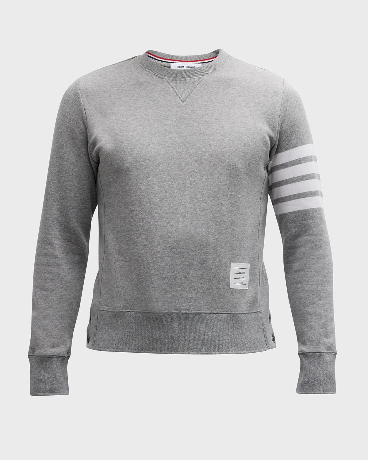 - Thom Browne classic sweatshirt. - Crew neckline. - Long sleeves with signature stripe on left arm. - Logo patch at bottom left. - Ribbed cuffs and hem. - Pullover style. - Cotton. - Imported.