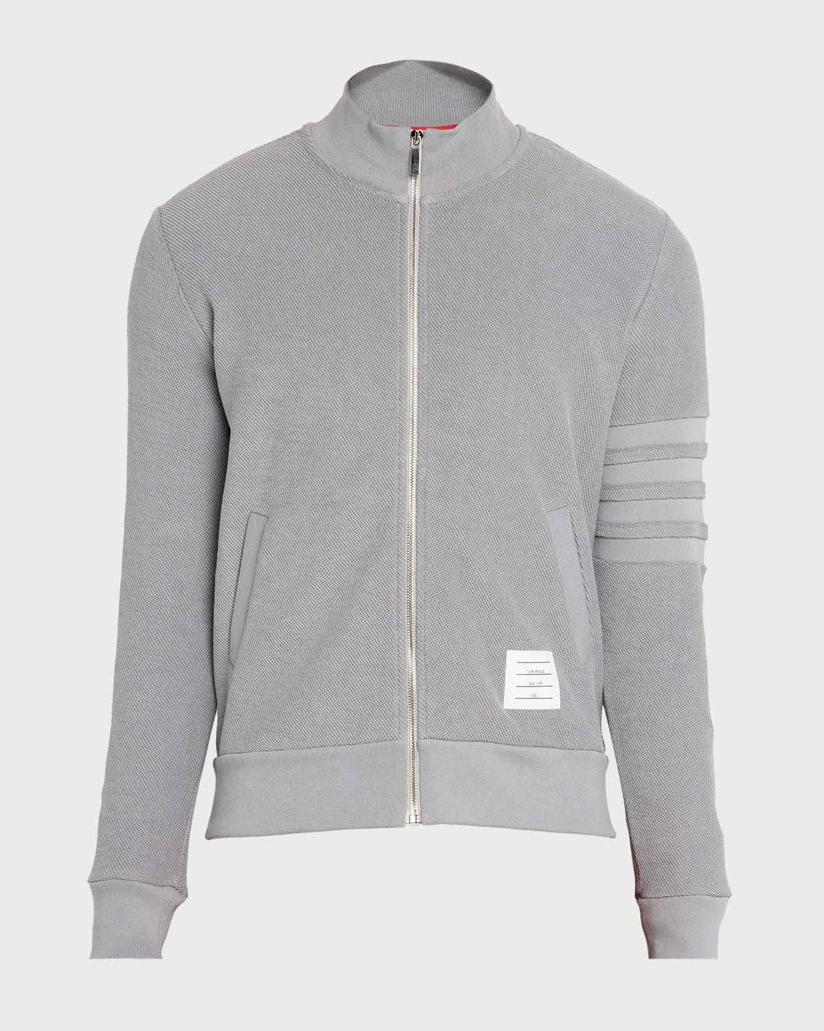 - Thom Browne jacket in reverse loopback cotton defined by a seamed signature 4-bar stripe on the sleeve - Back neck with striped grosgrain loop tab - Ribbed funnel neckline - Full-zip front - Side welt pockets - Long sleeves - Ribbed cuffs and hem - Name tag applique - Cotton - Dry clean - Made in Italy