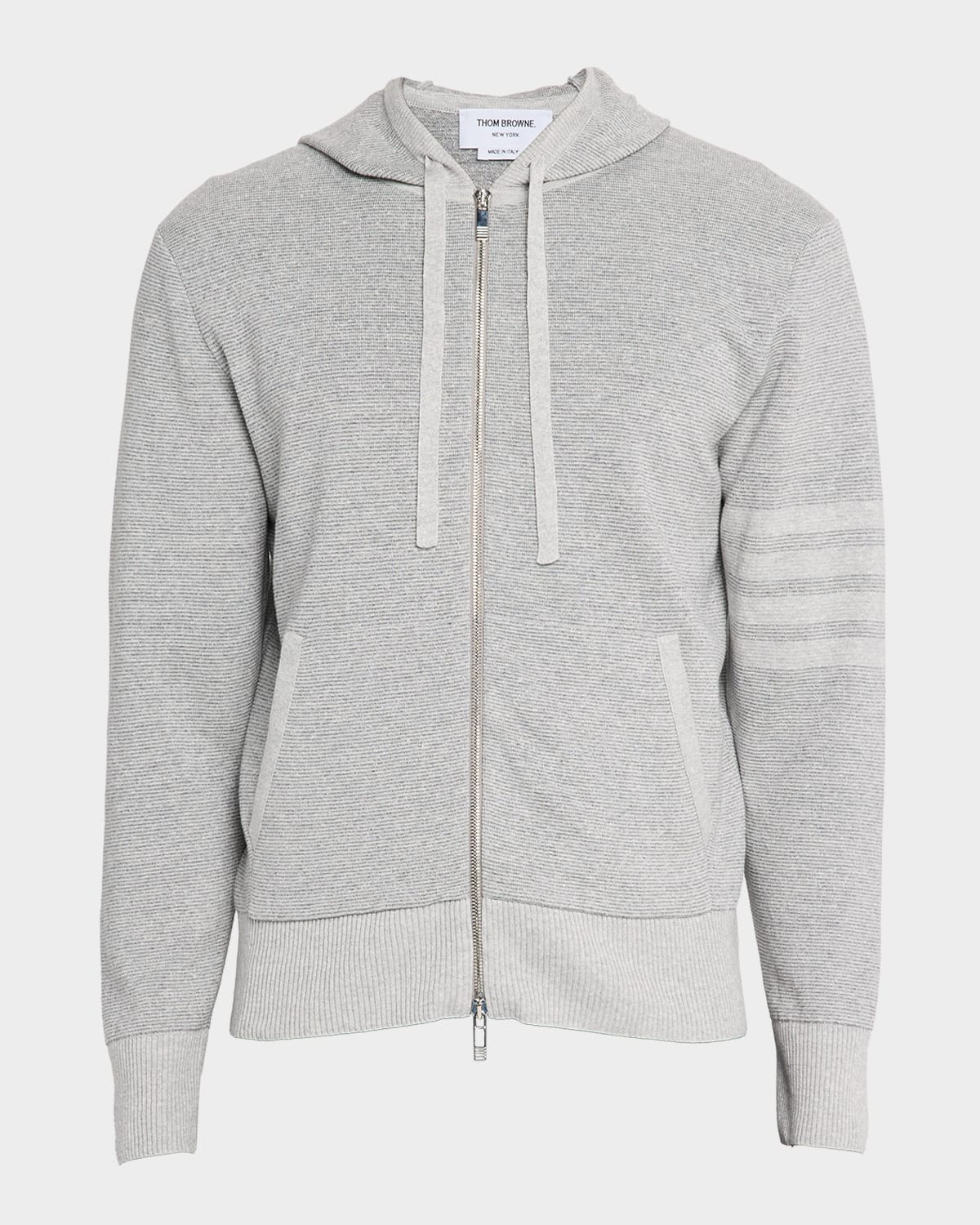 - Thom Browne hoodie in textured micro-stripe linen and cotton showcasing a tonal 4 bar stripe on the left sleeve - Hooded drawstring neckline - Full-zip front - Side welt pockets - Long sleeves - Ribbed cuffs and hem - Back signature stripe grosgrain loop tab - Relaxed fit - Linen/cotton - Made in Italy