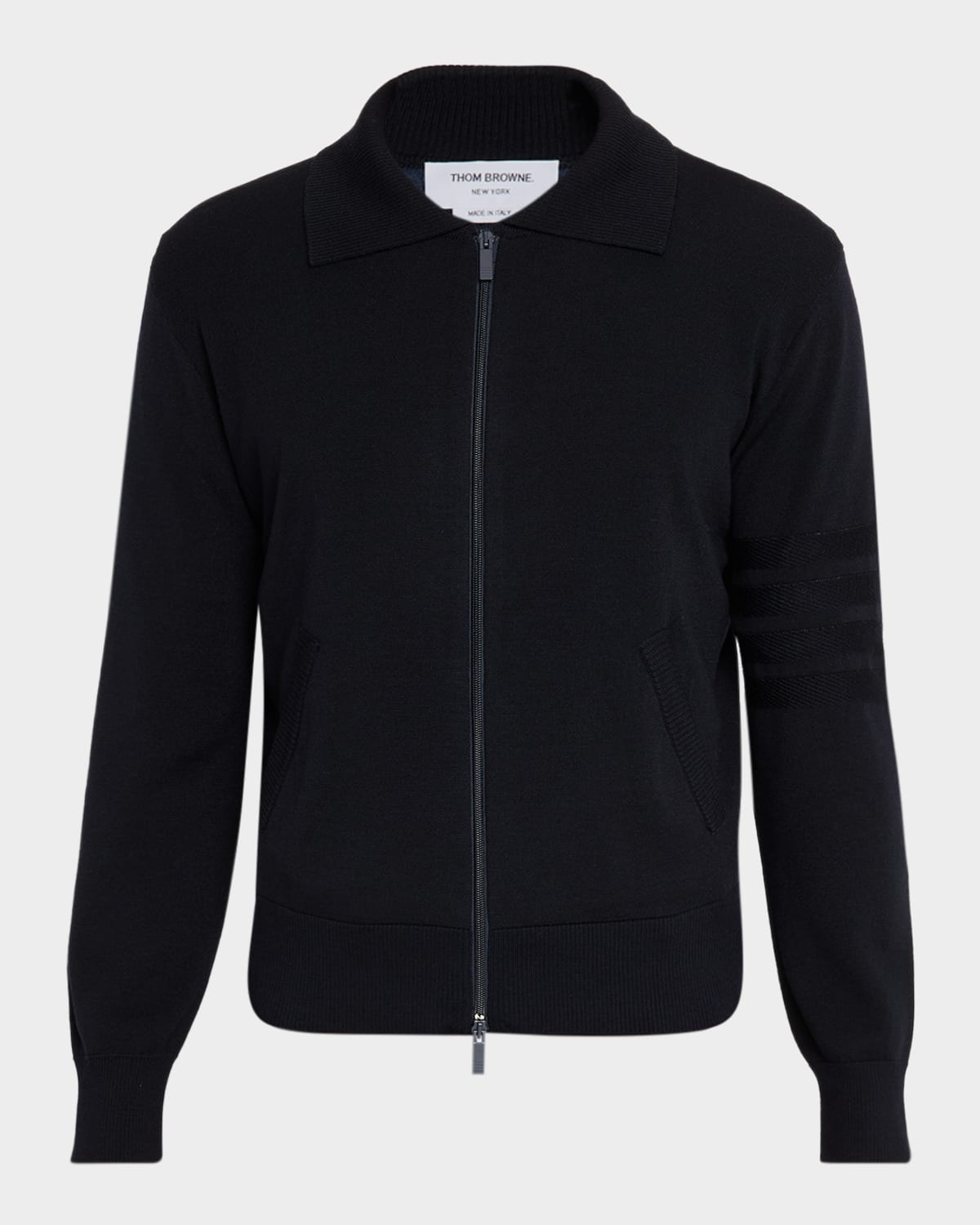 - Thom Browne solid knit sweater in a premium double-face wool blend - Tonal 4-bar stripe on the left sleeve - Spread collar - Two-way zip front - Side slip pockets - Long sleeves - Ribbed cuffs and hem - Signature striped grosgrain loop tab - Wool/linen/cotton - Dry clean - Made in Italy