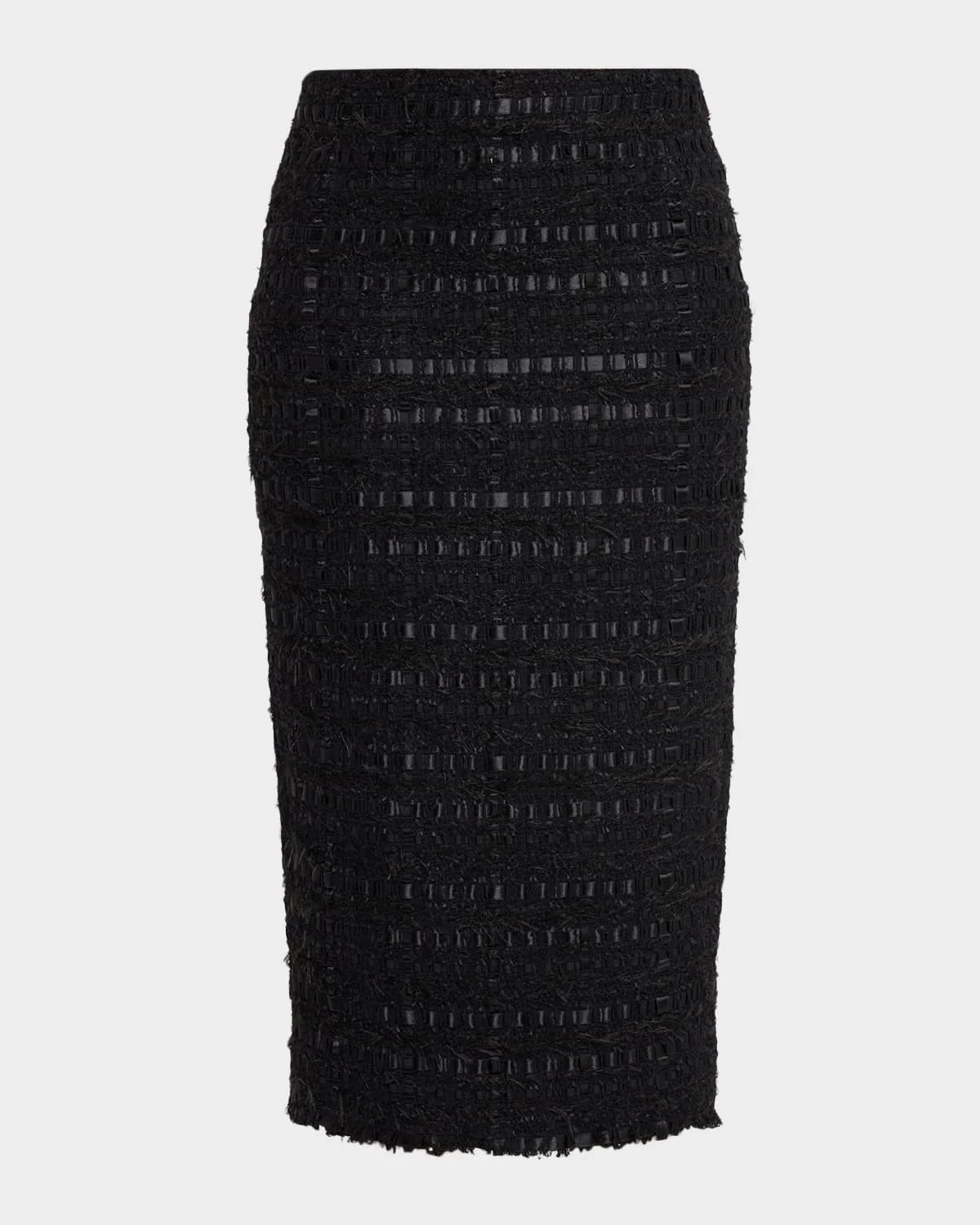 Ten different yarns, including grosgrain and satin ribbon, are woven together to create the richly dimensional surface of this Thom Browne pencil skirt. The luminous satin ribbon tweed is finished with signature frayed edges for a modern, textured look. High rise Back vent with RWB grosgrain trim Calf length Pencil style Side zip closure Polyester/cotton/nylon/polyamide Lining: Silk Dry clean Made in Italy SIZE & FITModel measurements: 5 & apos;10" tallModel is wearing a US size 4/Small