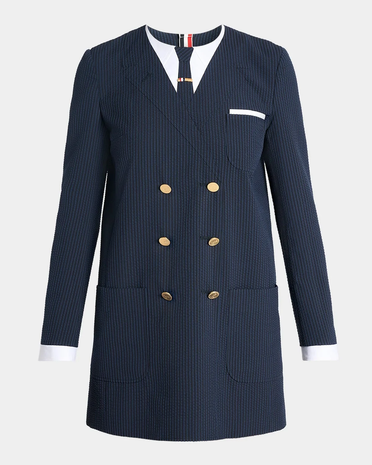 Thom Browne & nbsp;trompe l & apos;oeil suit dress is crafted from wool seersucker and cotton poplin Round neckline Long sleeves Sheath silhouette Mini length Invisible back zip Wool/cotton Dry clean Made in Italy