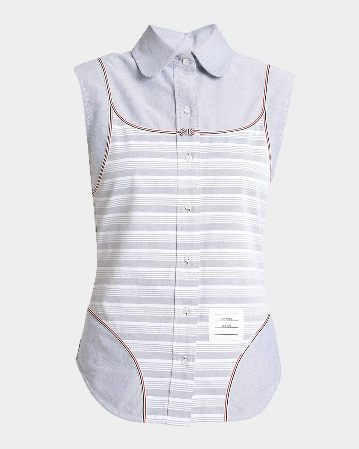 Thom Browne shirt is crafted from cotton oxford accented with a & nbsp;trompe l & apos;oeil & nbsp;one-piece swimsuit panel with signature grosgrain trim, front label patch, and a signature loop on the back of the neck Curved collar; button front Sleeveless Yoked back; loop Relaxed fit Shirttail hem Cotton Dry clean Made in Italy