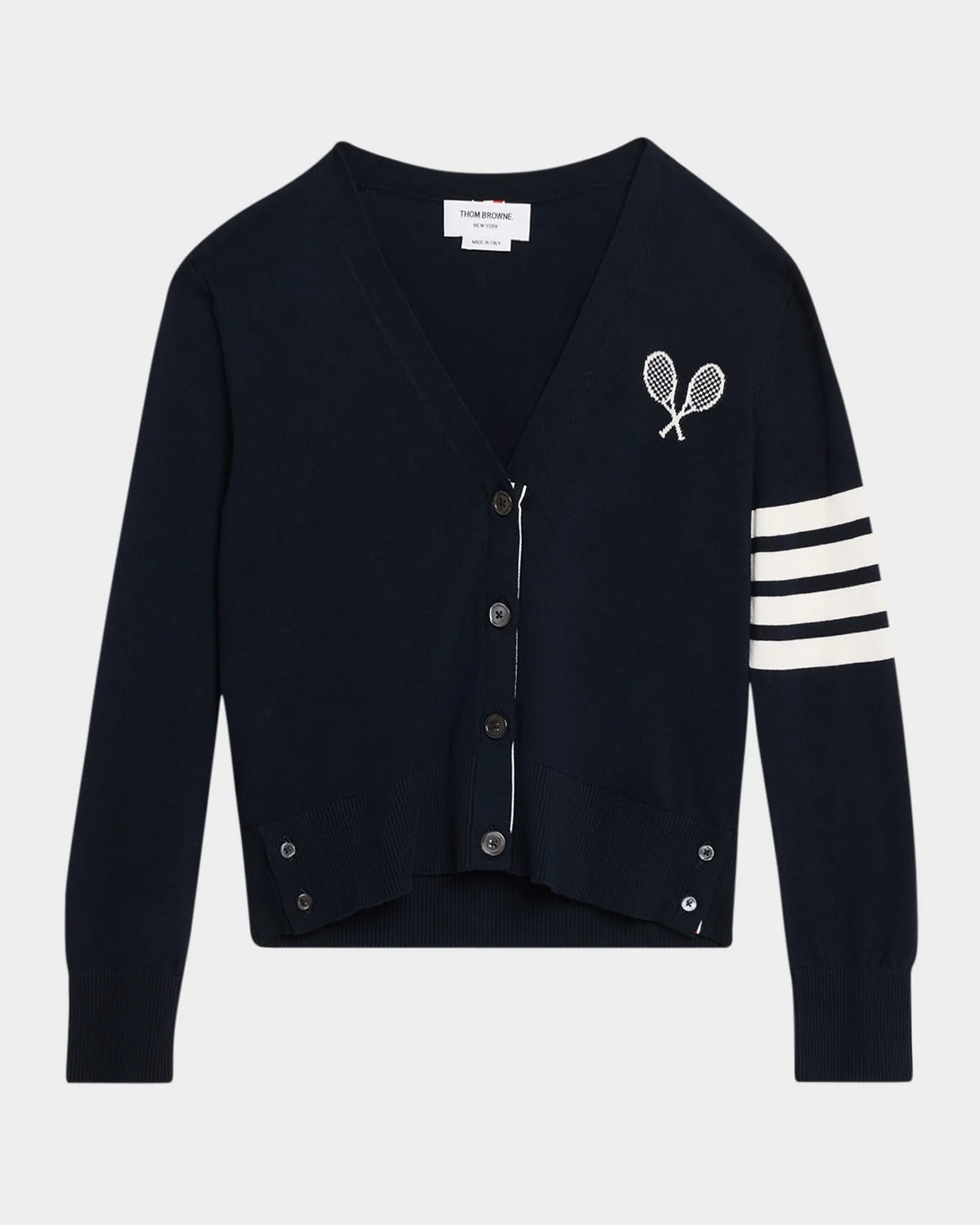 Embroidered with contrasting tennis racquets, this cardigan from Thom Browne features the brand & apos;s signature four stripes on the wearer & apos;s left sleeve V neckline Long sleeves; button cuffs Ribbed cuffs and hem Slim fit Hip length Button front closure Cotton Dry clean Made in Italy SIZE & FITModel measurements: 5 & apos;10" tallModel is wearing a US size 4/Small