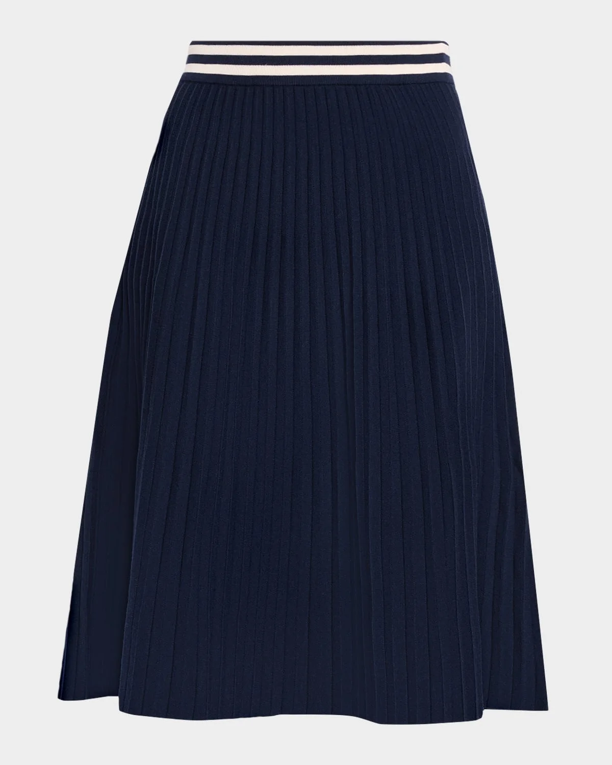 Thom Browne skirt is crafted from wide ribbed knit accented with a striped elasticized waistband and a signature striped grosgrain tab on the back High waist Knee length Aline silhouette pullon style Wool/polyester/silk Made in Italy