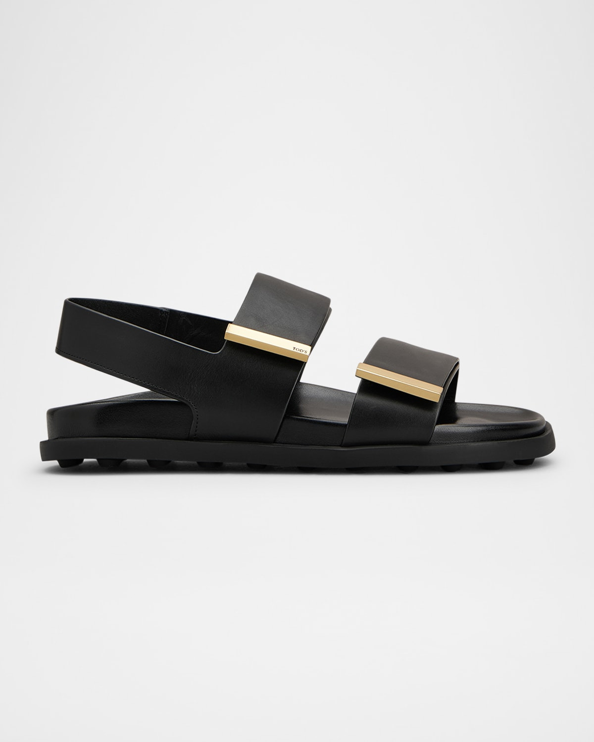 - Tod's easy sandals featuring adjustable straps and metal tag with embossed logo. - 0.25 in / 10 mm flat heel - Open toe - Dual strap upper - Slingback support band - Molded comfort footbed - Rubber outsole - Lining: Leather - Made in Italy