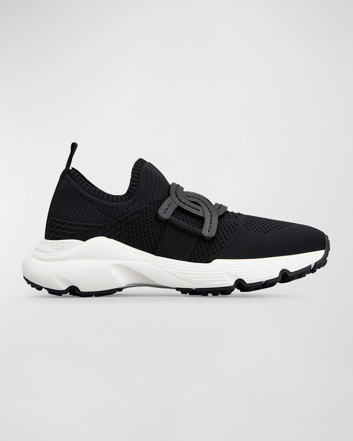 - Tod's "Kate" stretch knit fabric sneakers with leather trim. - Flat heel. - Round reinforced toe. - Elastic strap vamp. - Slip-on style. - Elastic sock collar. - Cushioned footbed. - Rubber sole. - Made in Italy. - Size Note: Item runs large, consider ordering a size down.