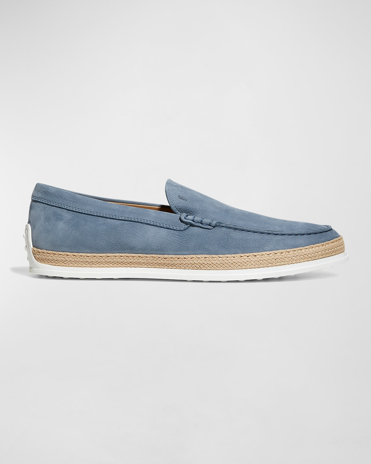 - Tod's "Nuova Pantofola Comma Rafia TV" loafers with suede upper - Flat heel; heel gaurd - Round moc toe - Notched vamp; stamped T-logo - Braided jute midsole - Slip-on style - Made in Italy