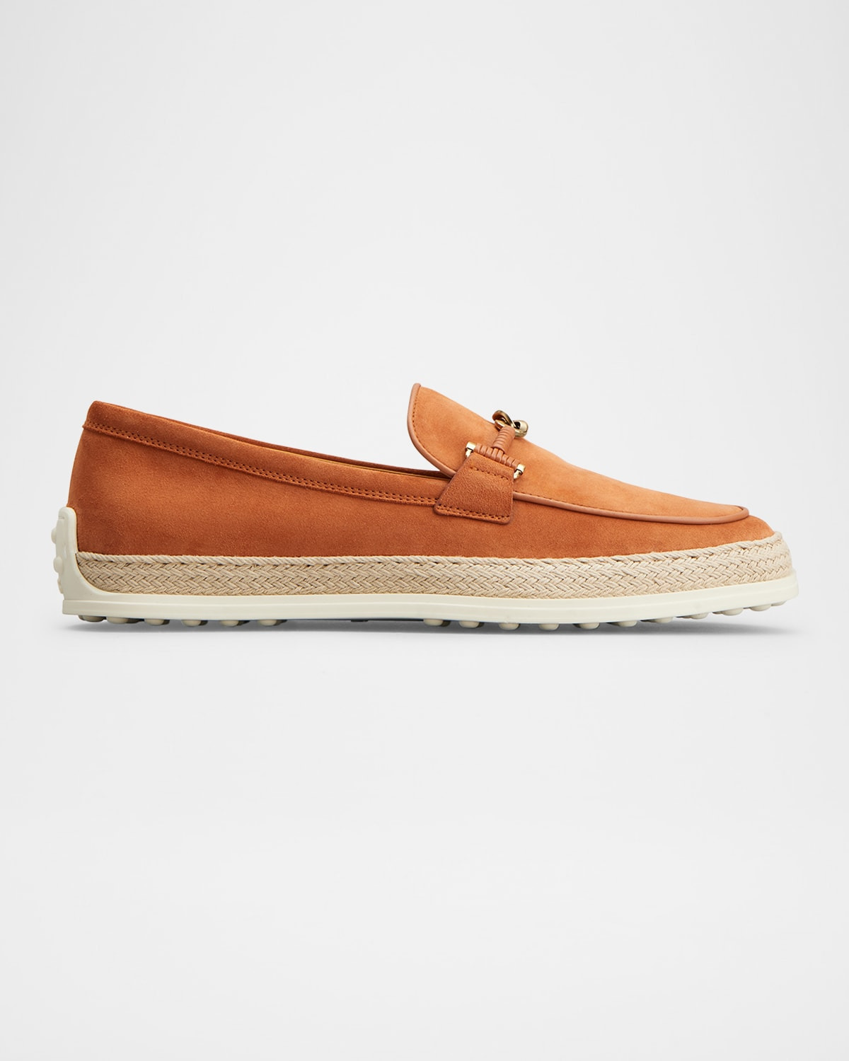 - Tod's slipper loafers in suede with raffia weaving - 0.25 in / 10 mm flat heel - Heel counter with embossed rubber pebbles - Double T-ring accessory covered by smooth leather tape - Slip-on style - Rubber outsole - Lining: Leather - Made in Italy