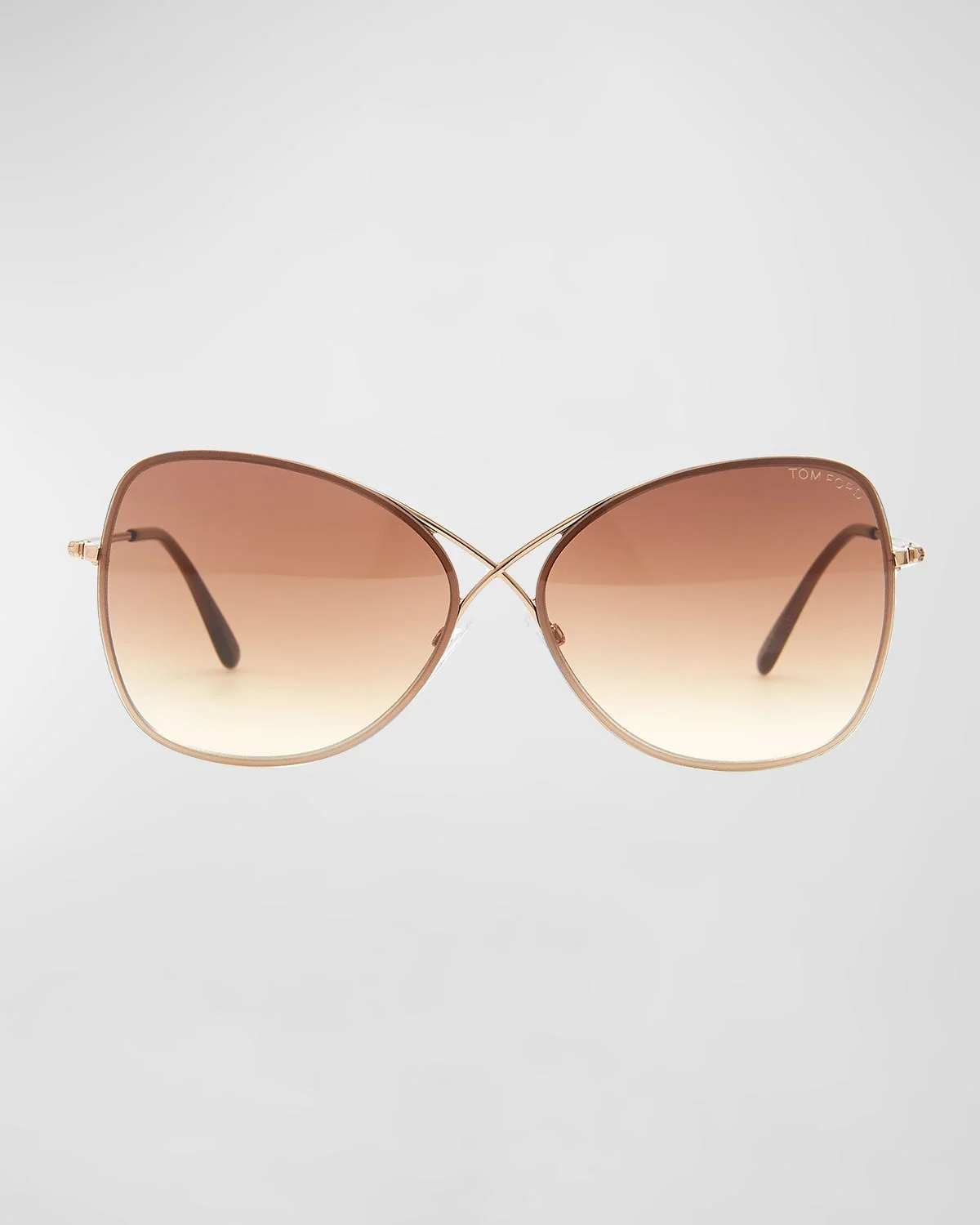 Shiny metal frames with gradient lenses. Signature Tom Ford crossover nose bridge. Logo text at left brow and sideways T logo adorns arms. 100% UVA/UVB protection. Made in Italy.