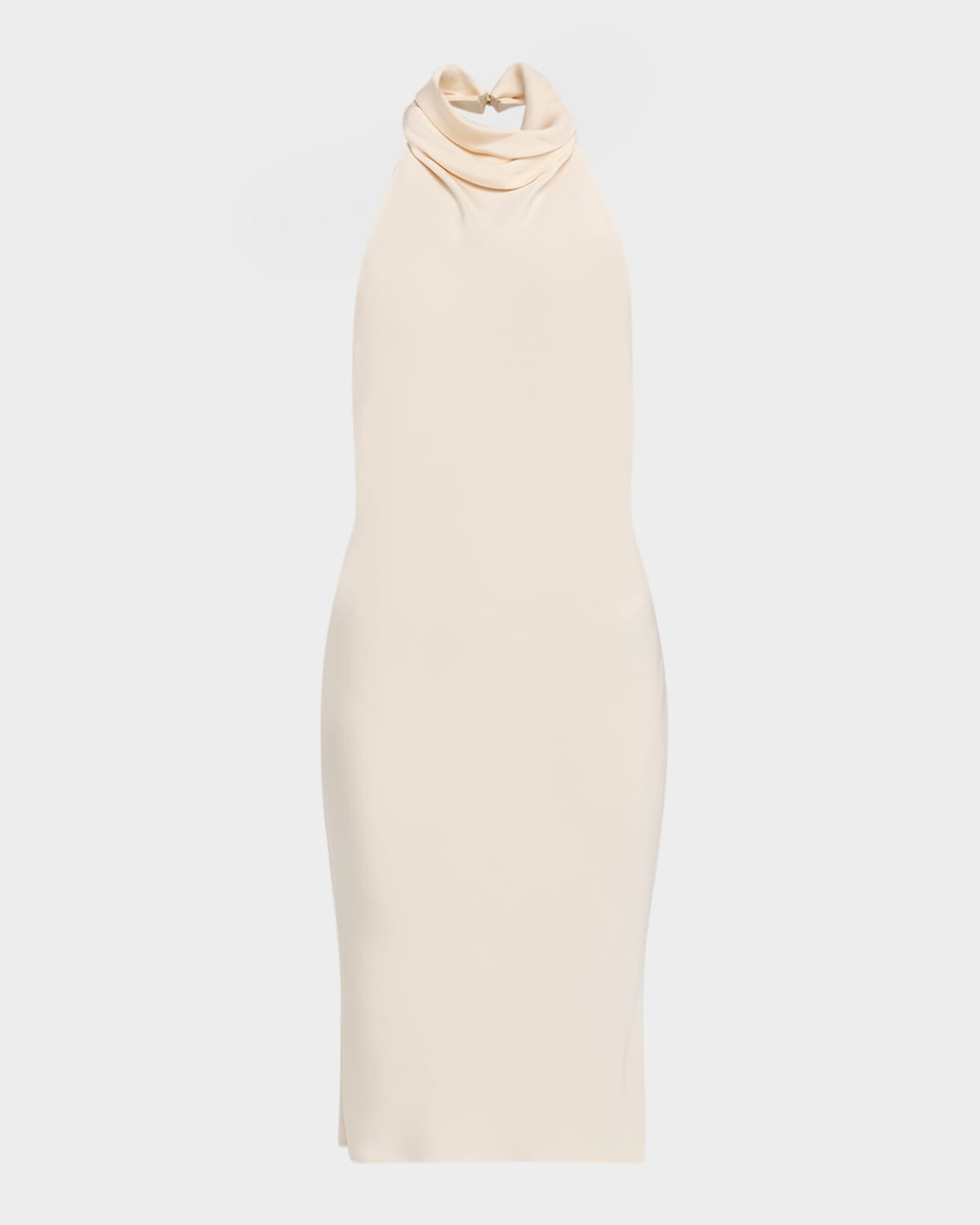 - TOM FORD silk sable dress featuring a draped open back - Cowl halter neckline; hook back - Sleeveless - Sheath silhouette - Knee length - Side zip - Silk - Made in Italy