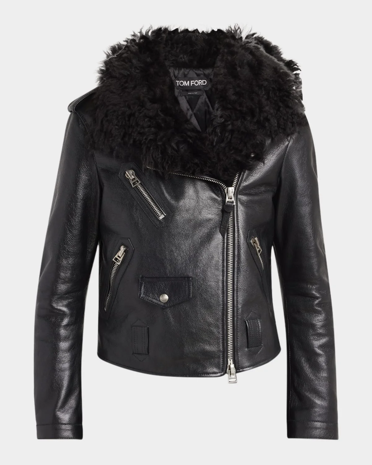 - TOM FORD grain calfskin leather biker jacket featuring a natural and dyed curly sheep shearling (Italy) collar - Notch lapels; off-center two-way zip front - Long sleeves; zip cuffs - Shoulder epaulets - Chest and hip zip pockets - Front snap-flap pockets - Straight fit - Hip length - Belt loop hem - Leather/shearling/polyacetelyne - Made in Spain