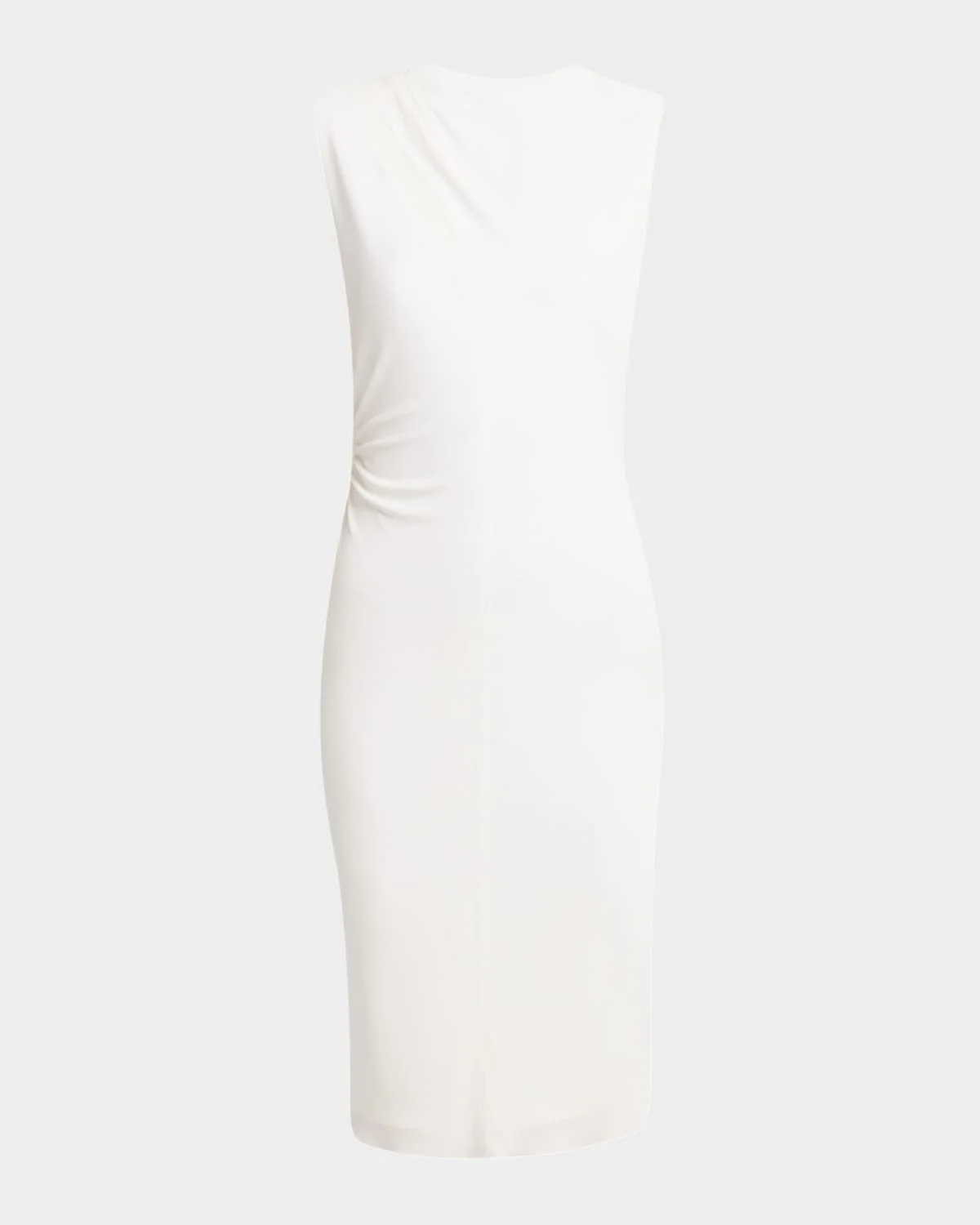 - TOM FORD viscose crepe jersey cocktail dress featuring a chest slash cutout, gathered side, and a shoulder drape - Round neckline - Sleeveless - Knee length - Sheath silhoette - Back zip - Viscose - Made in United Kingdom