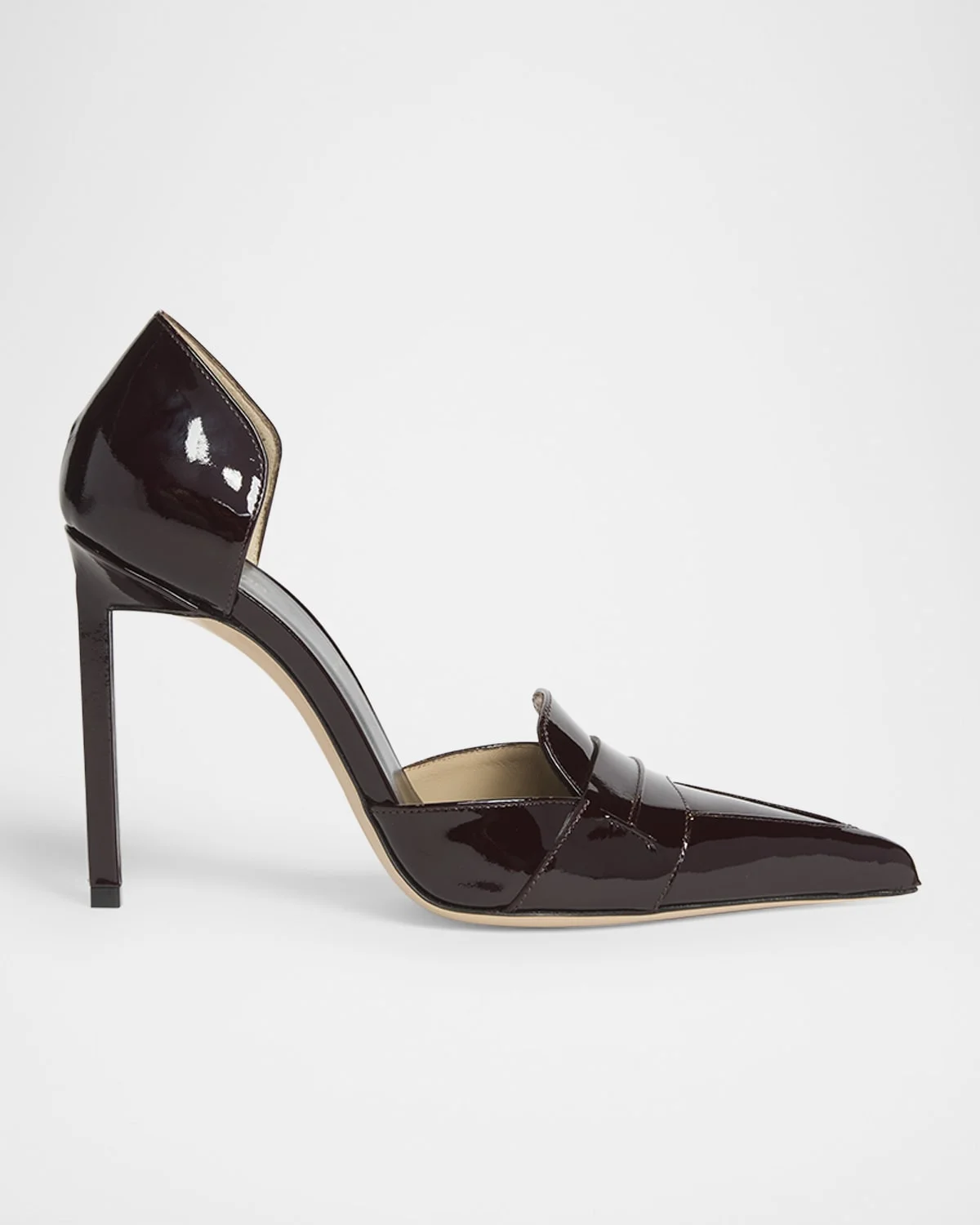 - Borrowing elements from a classic loafer, the "Eva" d'Orsay pumps by TOM FORD are crafted from shiny patent calf leather - 4.25 in / 105 mm stiletto heel - Pointed toe - Notched vamp with keeper strap - Slip-on style - Goat leather lining with logo print - Leather outsole - Made in Italy