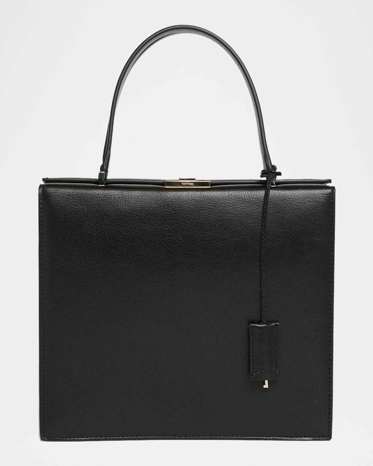 The TOM FORD "Jean" tophandle bag embodies clean and refined elegance, crafted of supple grain leather in a crisp architectural shape Flat top handles Foldover top with key fastening Detachable logodebossed key bell Center zip divides interior, one card slot Nappa leather lining Approx. 10.2"H x 8.7"W x 2.8"D Made in Italy