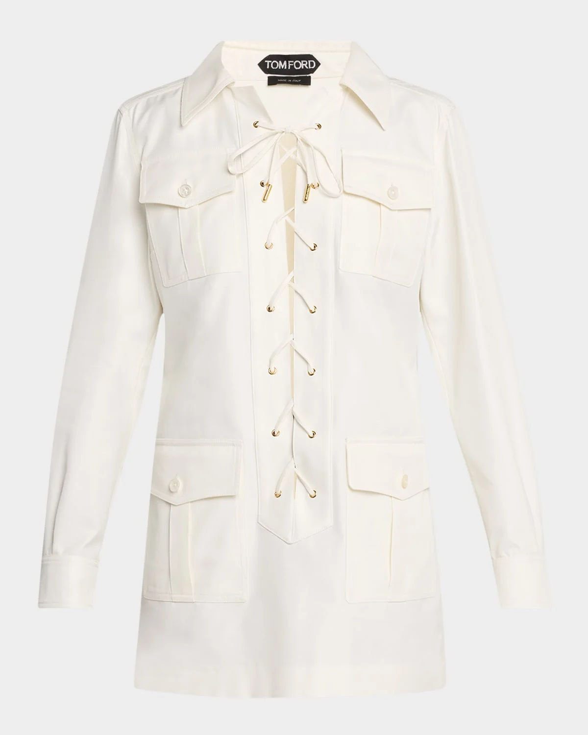 - TOM FORD twill safari tunic dress featuring a lace-up front detail and front button-flap pockets - Spread collar - Long sleeves; button cuffs - Yoked back; box pleat - Shift silhouette - Mini length - Side slits - Slipover style - Cotton/silk/mother-of-pearl - Made in Italy