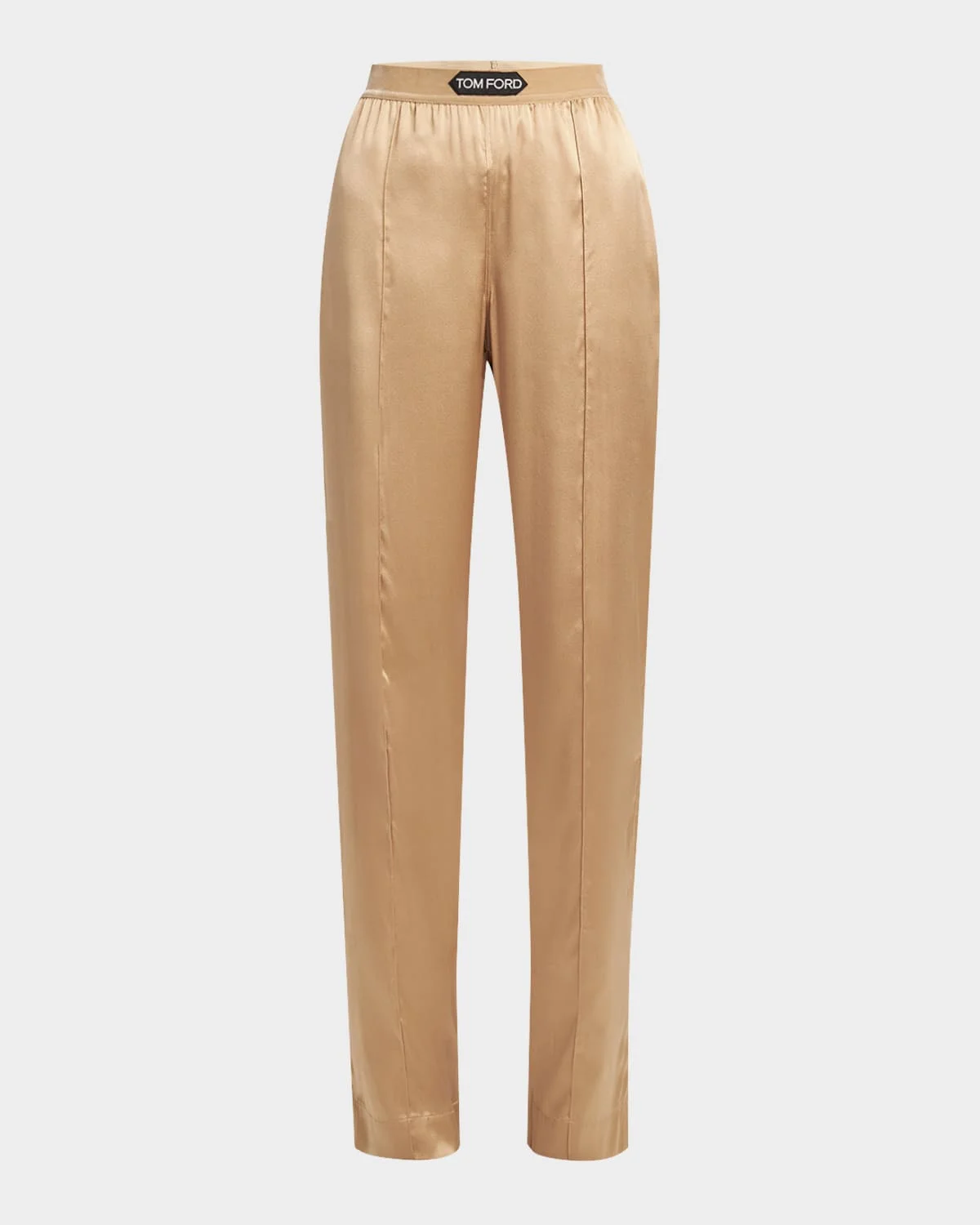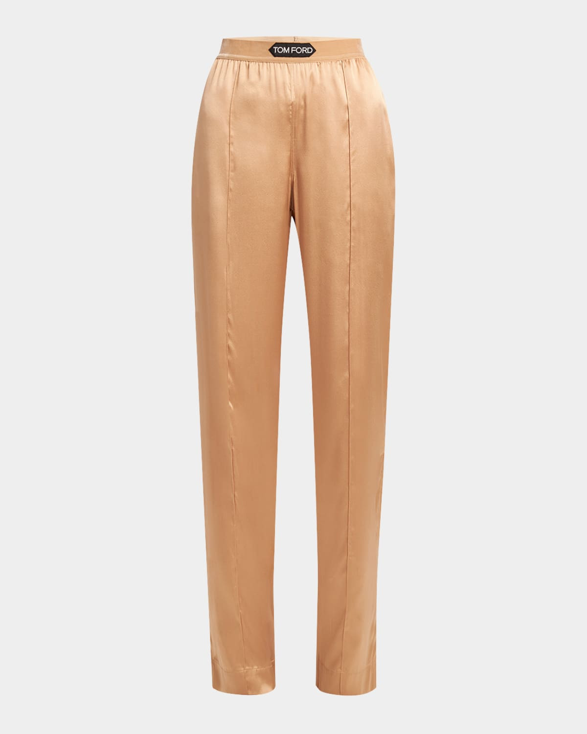 - TOM FORD silk pants with logo waistband - Approx. 34.5" inseam - High rise - Pinch seam front - Side slip pockets; back patch pockets - Straight legs - Full length - Pull-on style - Silk/spandex - Nylon/spandex, trim - Dry clean only - Made in Italy - Model is 5'10"/177cm.