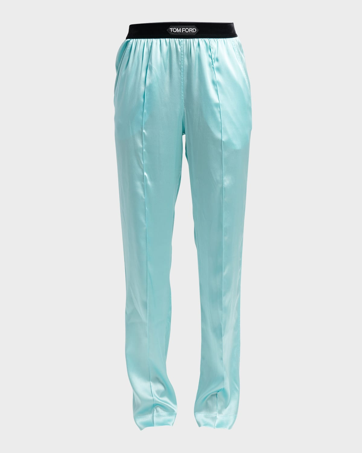 - TOM FORD silk pants with logo waistband - Approx. 34.5" inseam - High rise - Pinch seam front - Side slip pockets; back patch pockets - Straight legs - Full length - Pull-on style - Silk/spandex - Nylon/spandex, trim - Dry clean only - Made in Italy - Model is 5'10"/177cm.