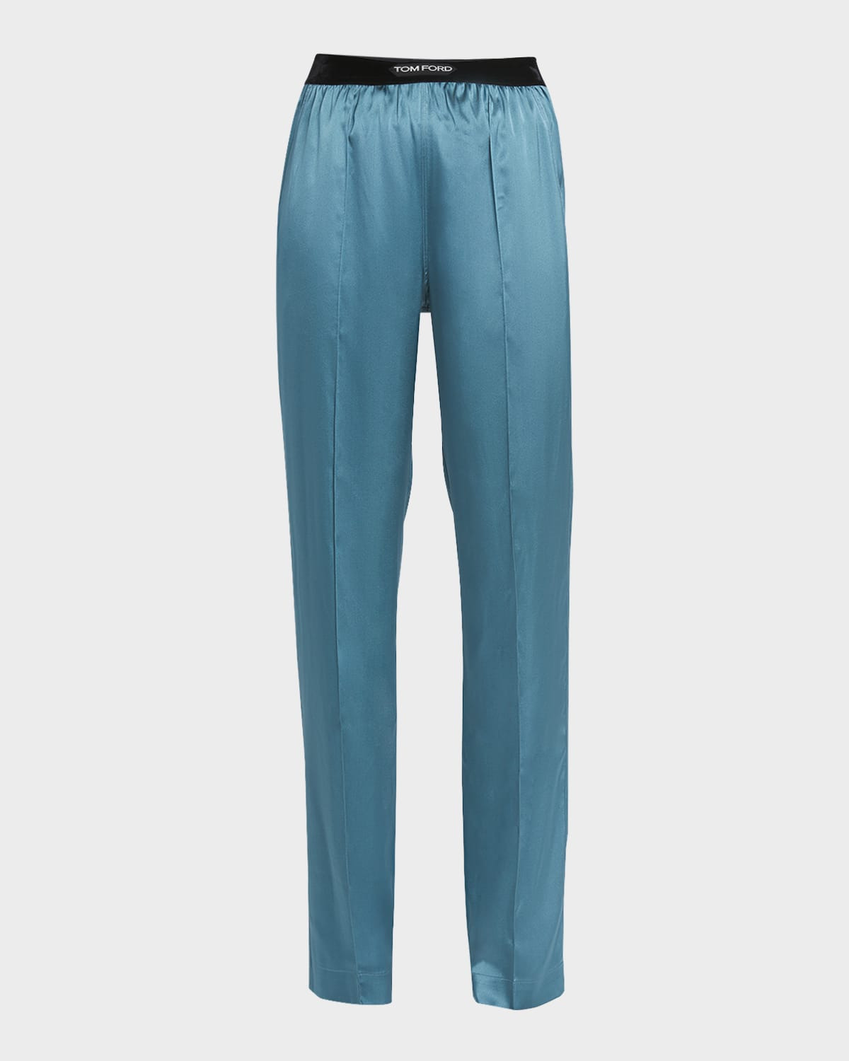 - TOM FORD silk pants with logo waistband - Approx. 34.5" inseam - High rise - Pinch seam front - Side slip pockets; back patch pockets - Straight legs - Full length - Pull-on style - Silk/spandex - Nylon/spandex, trim - Dry clean only - Made in Italy - Model is 5'10"/177cm.
