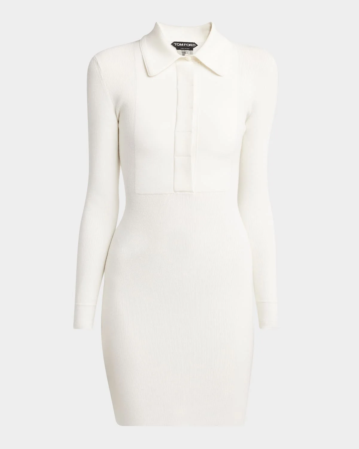 TOM FORD polo shirtdress in fine stretch ribbed knit with a bib front Spread collar; concealed sixbutton front Long sleeves Bodyskimming silhouette Midthigh length Slipover style Virgin wool/viscose/polyester Made in Italy