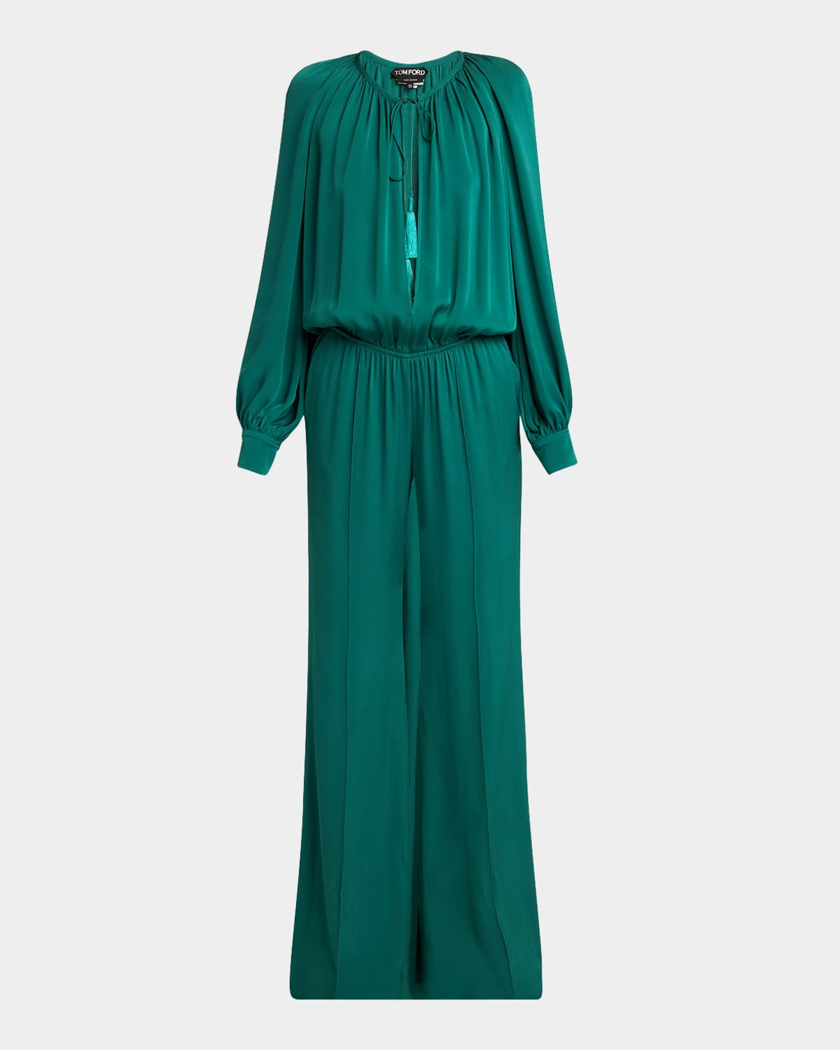 - TOM FORD crepe cady jumpsuit fetauring a gathered neck with tassel ties - Plunging neckline - Long blouson sleeves; button cuffs - Elasticized wiastband - Pintuck seams - Side split pockets - Wide legs - Full length - Pull-on style - Viscose - Lining: Silk - Made in Italy
