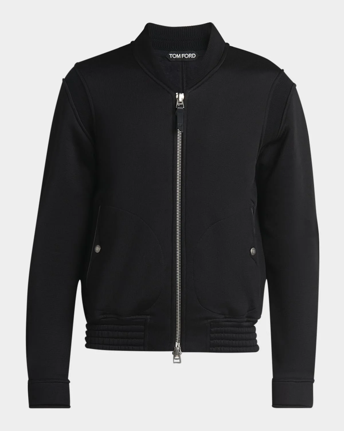 TOM FORD bomber jacket sylized with ribbed paneling on the shoulders for a distinctive touch Ribbed baseball collar Two-way zip front Snap side pockets Long sleeves Round barrel cuffs Ribbed hem Cotton/viscose Fully lined Professional cleaning recommended, wash inside out Made in Italy