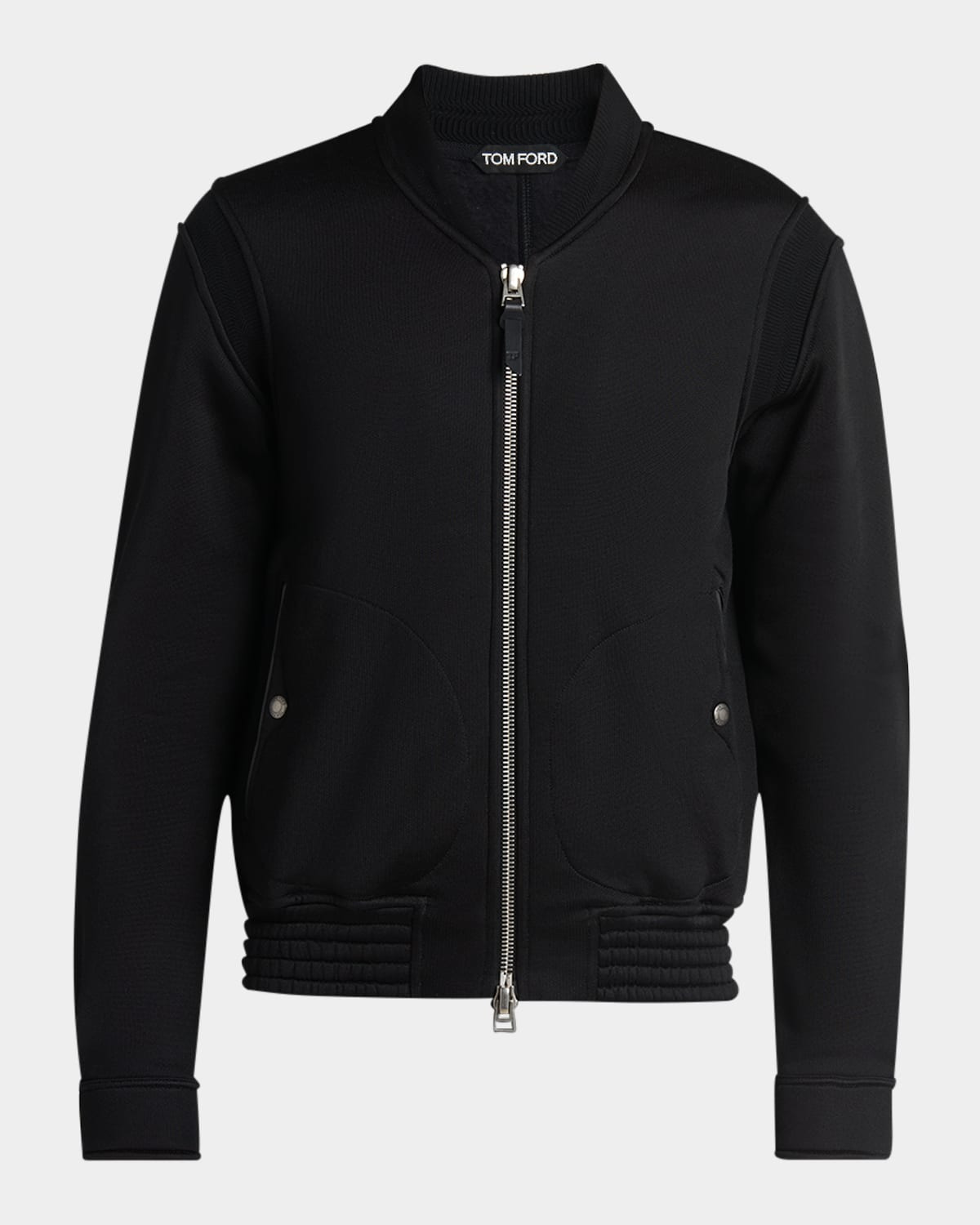 - TOM FORD bomber jacket sylized with ribbed paneling on the shoulders for a distinctive touch - Ribbed baseball collar - Two-way zip front - Snap side pockets - Long sleeves - Round barrel cuffs - Ribbed hem - Cotton/viscose - Fully lined - Professional cleaning recommended, wash inside out - Made in Italy