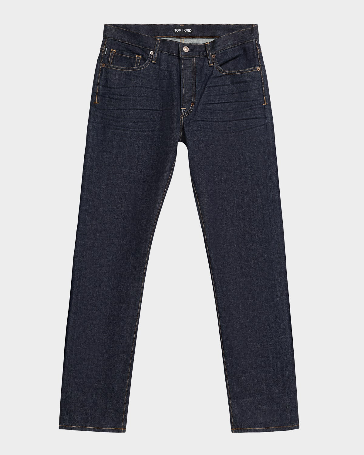 - TOM FORD jeans in dark-rinse selvedge denim with subtle T-initial branding found on the contrast stitching - Regular rise - Five-pocket style - Classic fit through straight legs - Button-zip front; belt loops - Cotton/polyurethane - Professional cleaning recommended - Made in USA