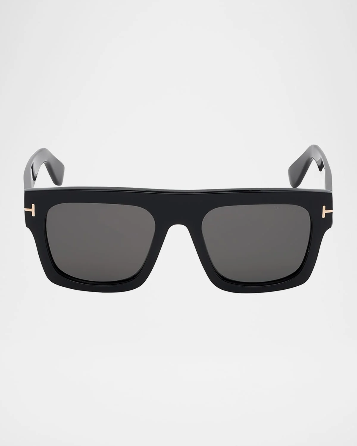 - Tom Ford "Fausto" sunglasses. - Thick square acetate frames. - Solid smoke lenses. - Metal "T" insets at temples. - 100%25 UVA/UVB protection. - Universal fit.