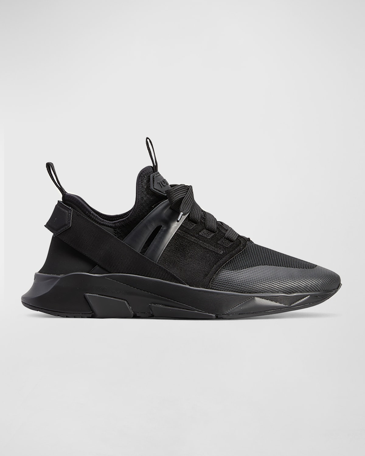 TOM FORD "Jago" soft trainer sneaker with leather trim. Heel height, approx. 0.2" Socklike construction forms to foot. Pullon style; tabbed tongue and backstay. Reinforced round toe. Laceup vamp; logo detail. Supportive heel strap. Polyester/viscose/cotton/nylon. Rubber outsole. Made in Italy.