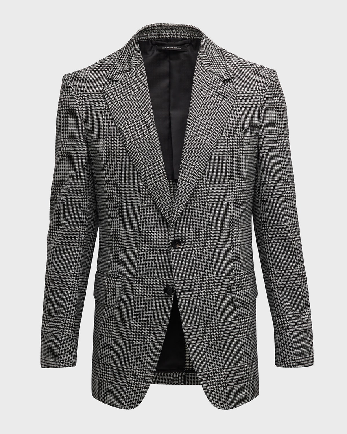 - TOM FORD "Shelton" sport jacket in Glen plaid - Notched lapels; two-button front - Chest welt pocket - Side flap pockets - Unfinished sleeves - Double-vented back - Wool/mohair/silk - Lining: Cupro/silk - Made in Italy - Model is 6'1"/185cm.