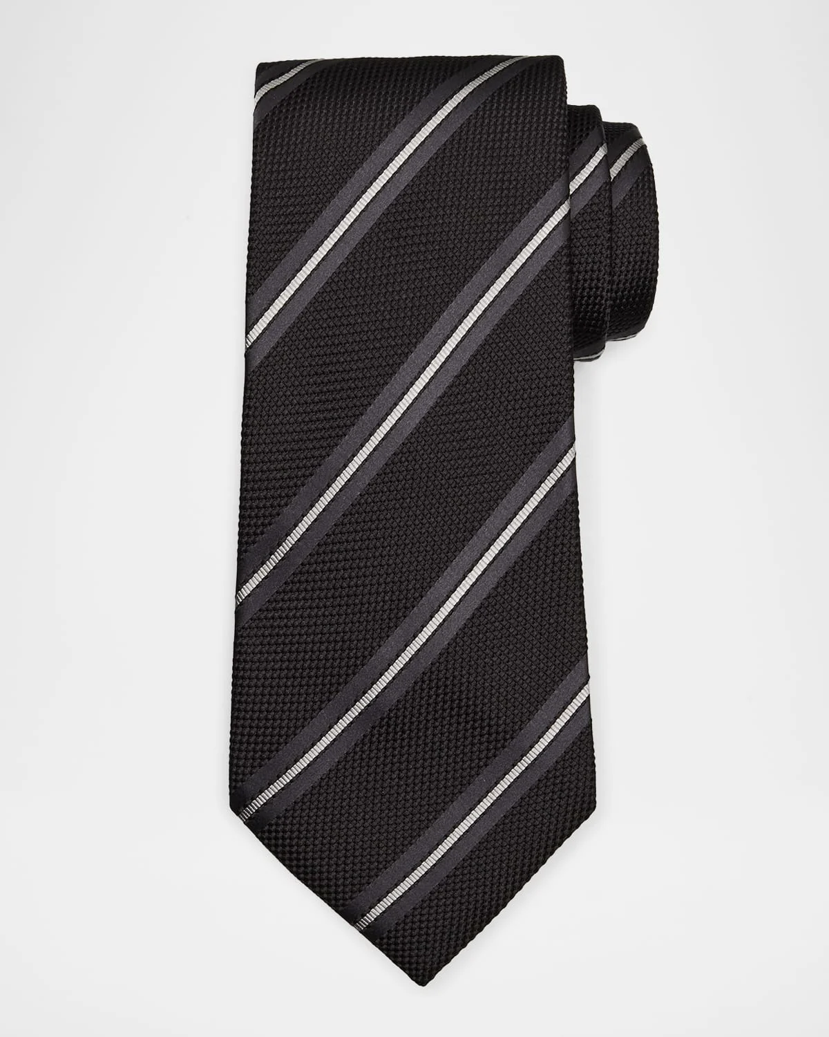 - TOM FORD silk tie in two-tone diagonal stripes - May be styled in multiple ways - Approx. 3.5"W - Silk - Professional cleaning recommended - Made in Italy - Proposition 65 warning for California residents