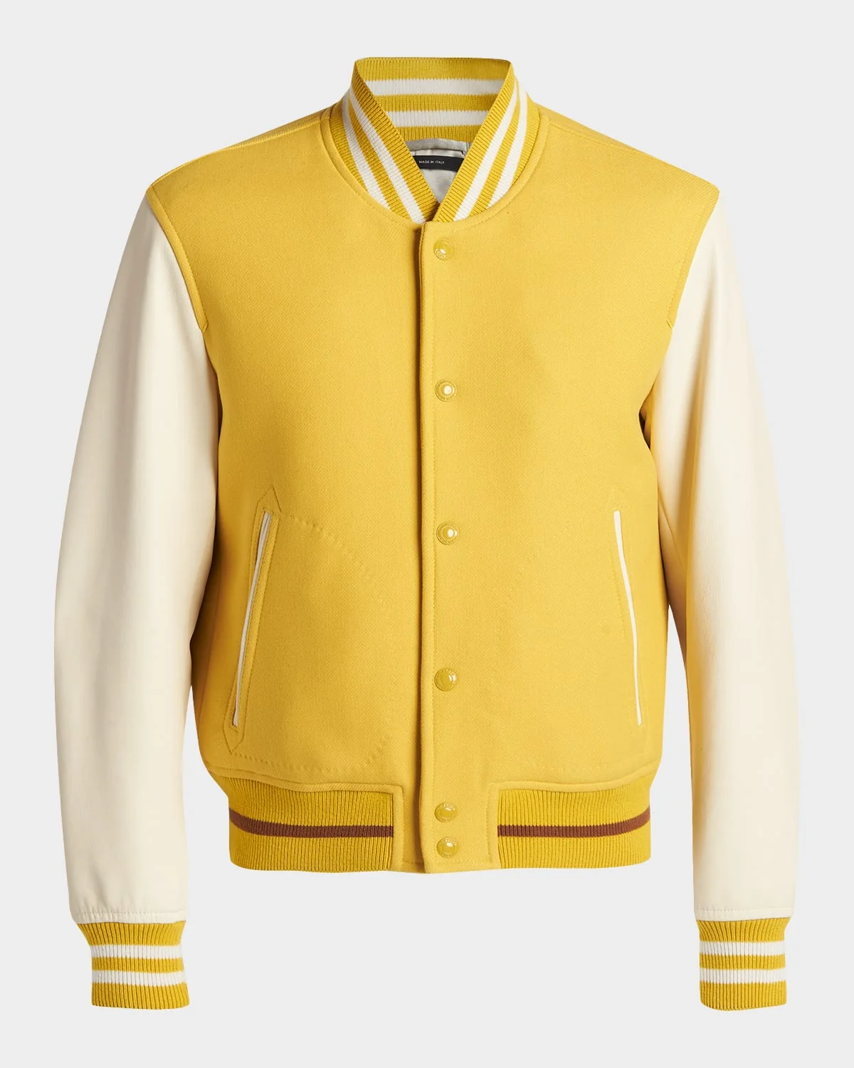 TOM FORD varsity bomber jacket is crafted from wool twill accented with leather sleeves, striped trim, and a diamond padded lining Baseball collar; singlebreasted front Long sleeves Hip double welt pockets Regular fit Hip length Ribbed cuffs and hem Snapbutton closure Virgin wool/leather Professional cleaning recommended Made in Italy