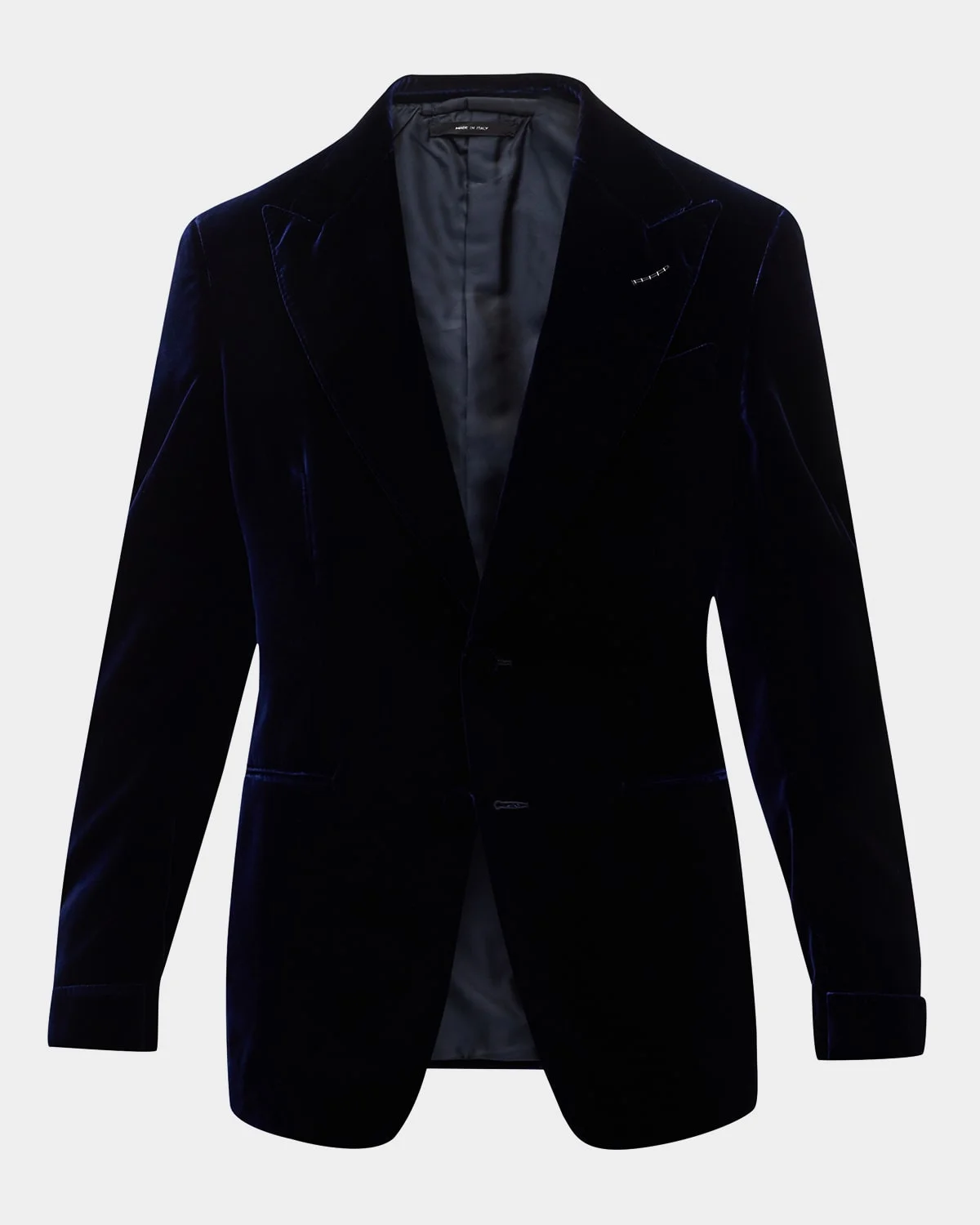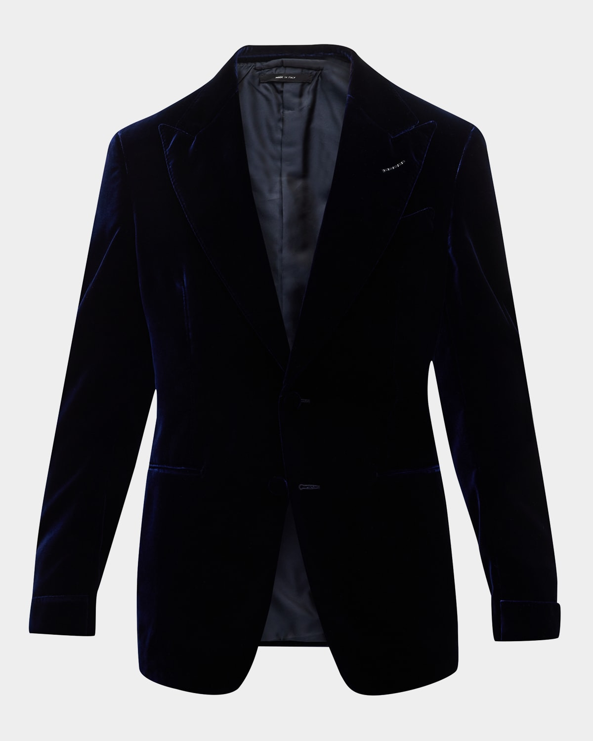 - TOM FORD cocktail jacket in solid velvet - Peak lapels; two-button front - Welt pockets - Unfinished sleeves - Single back vent - Wool/silk - Made in Italy - Model is 6'1"/185cm.