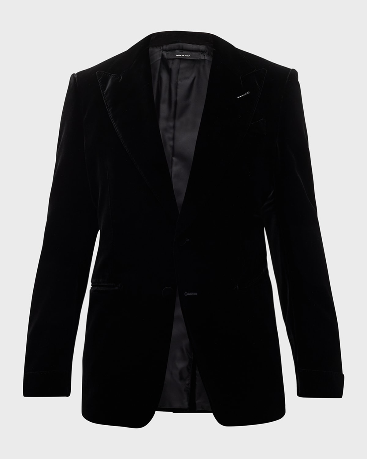 - TOM FORD cocktail jacket in solid velvet - Peak lapels; two-button front - Welt pockets - Unfinished sleeves - Single back vent - Wool/silk - Made in Italy - Model is 6'1"/185cm.